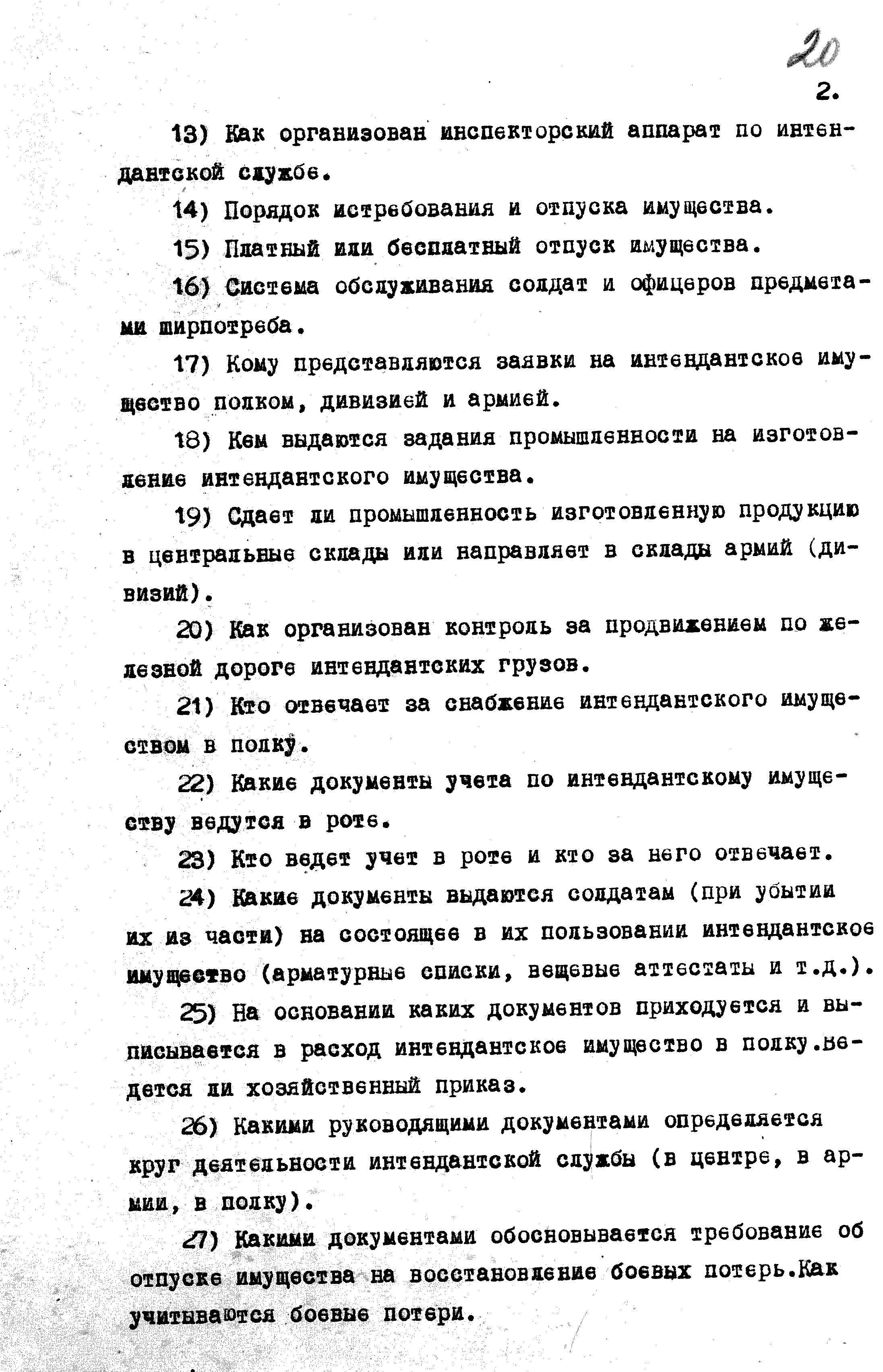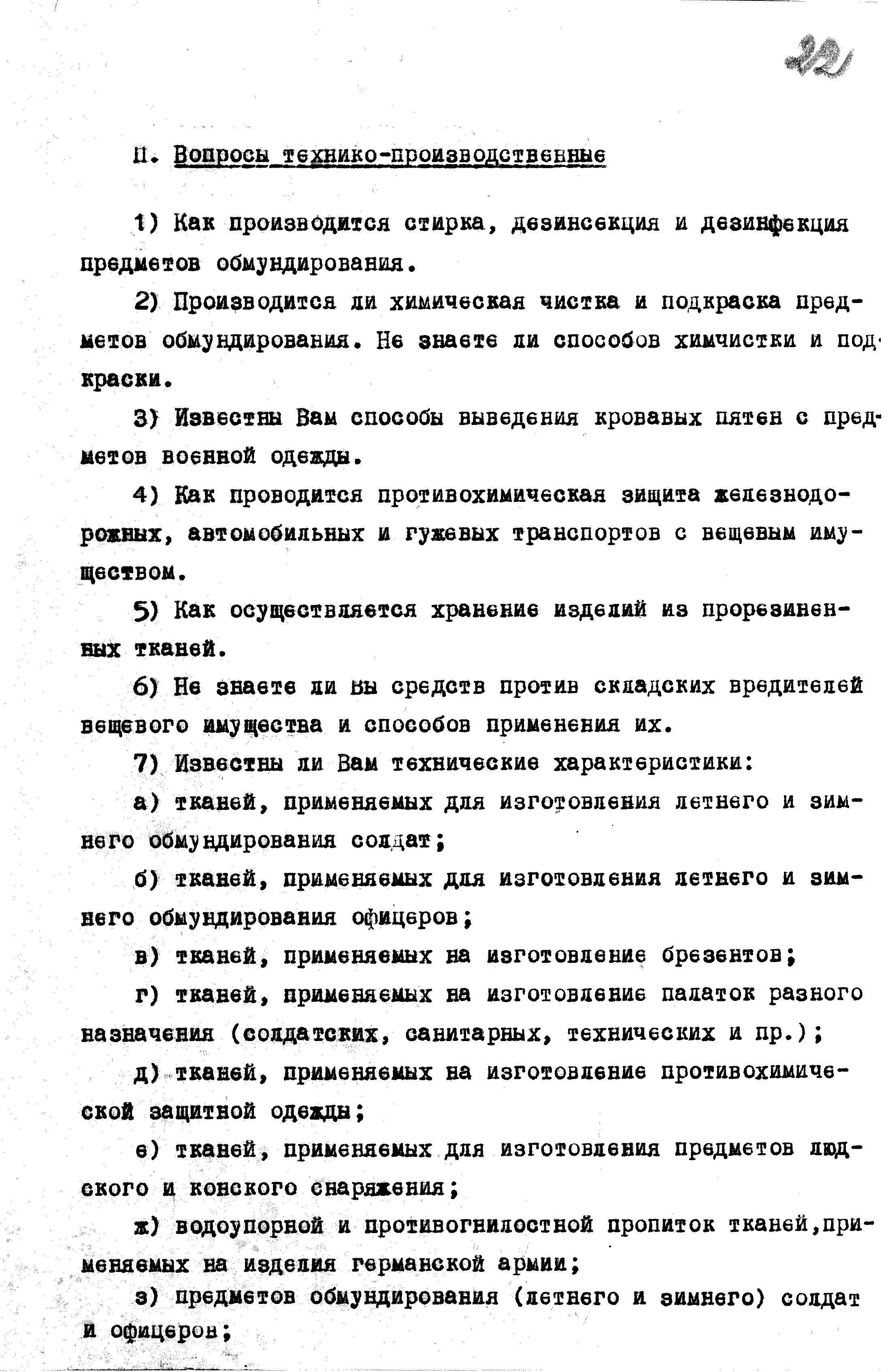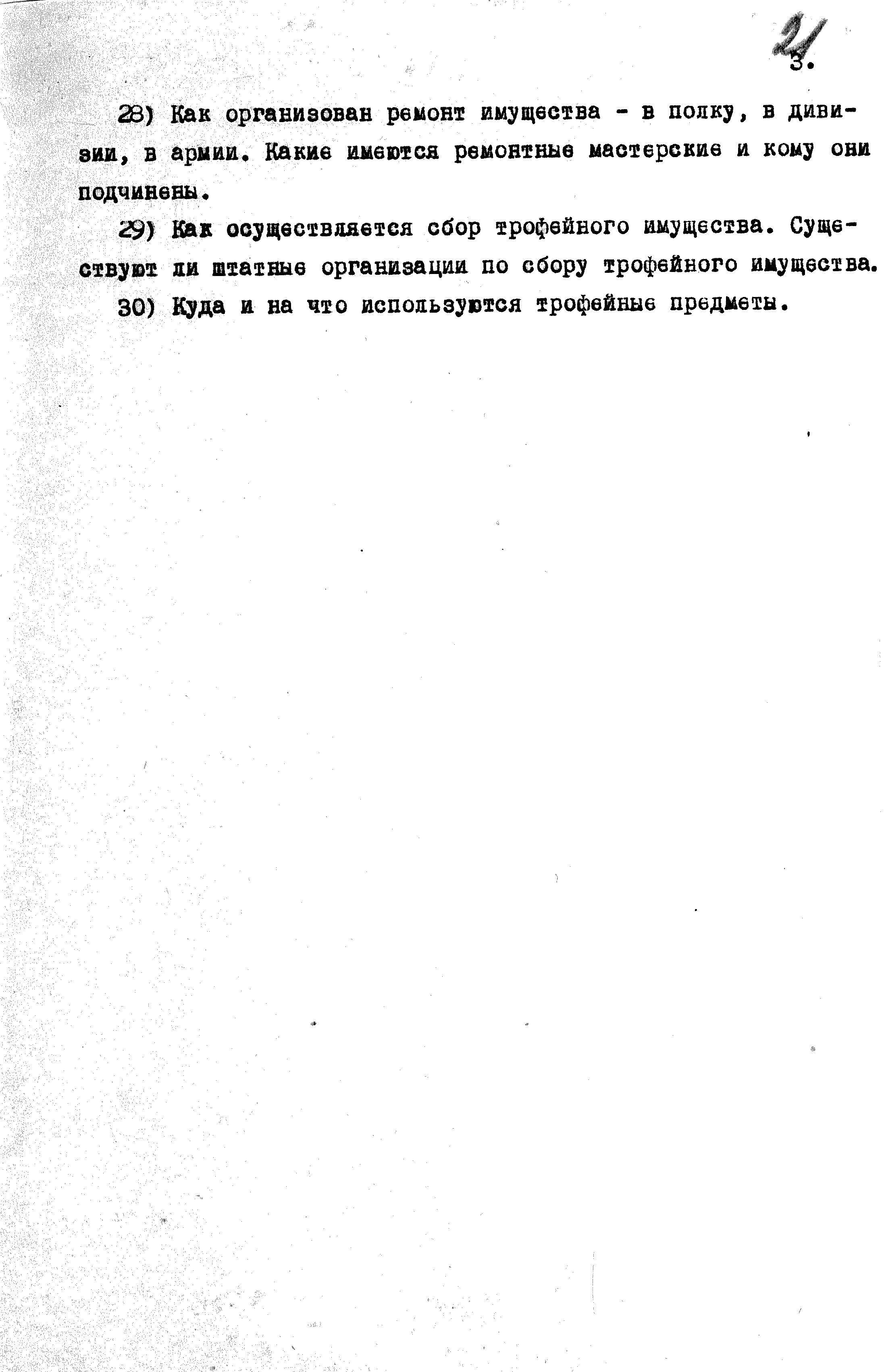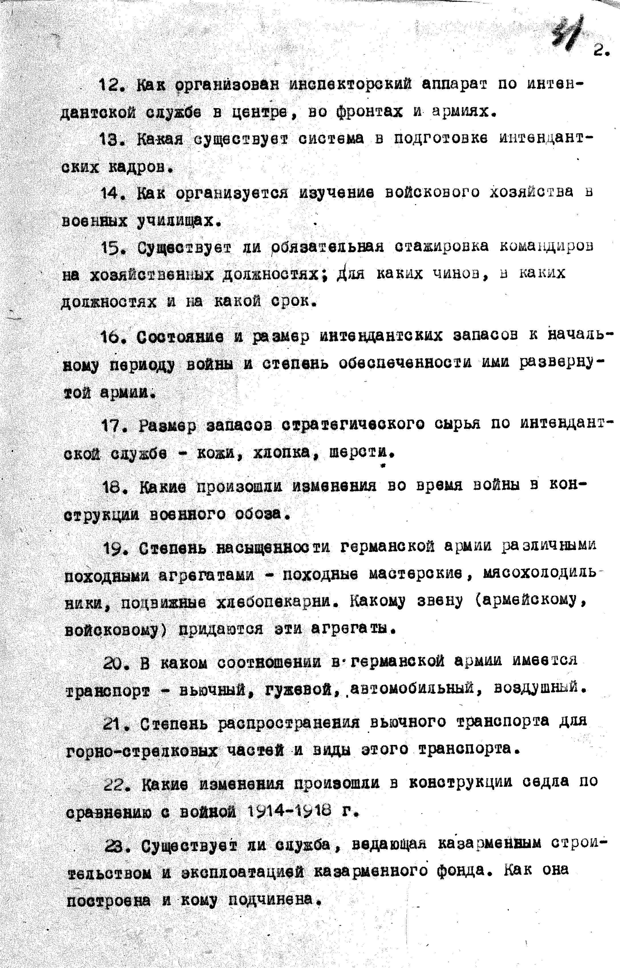 Перечень вопросов по интендантской службе для опросов пленных гитлеровцев