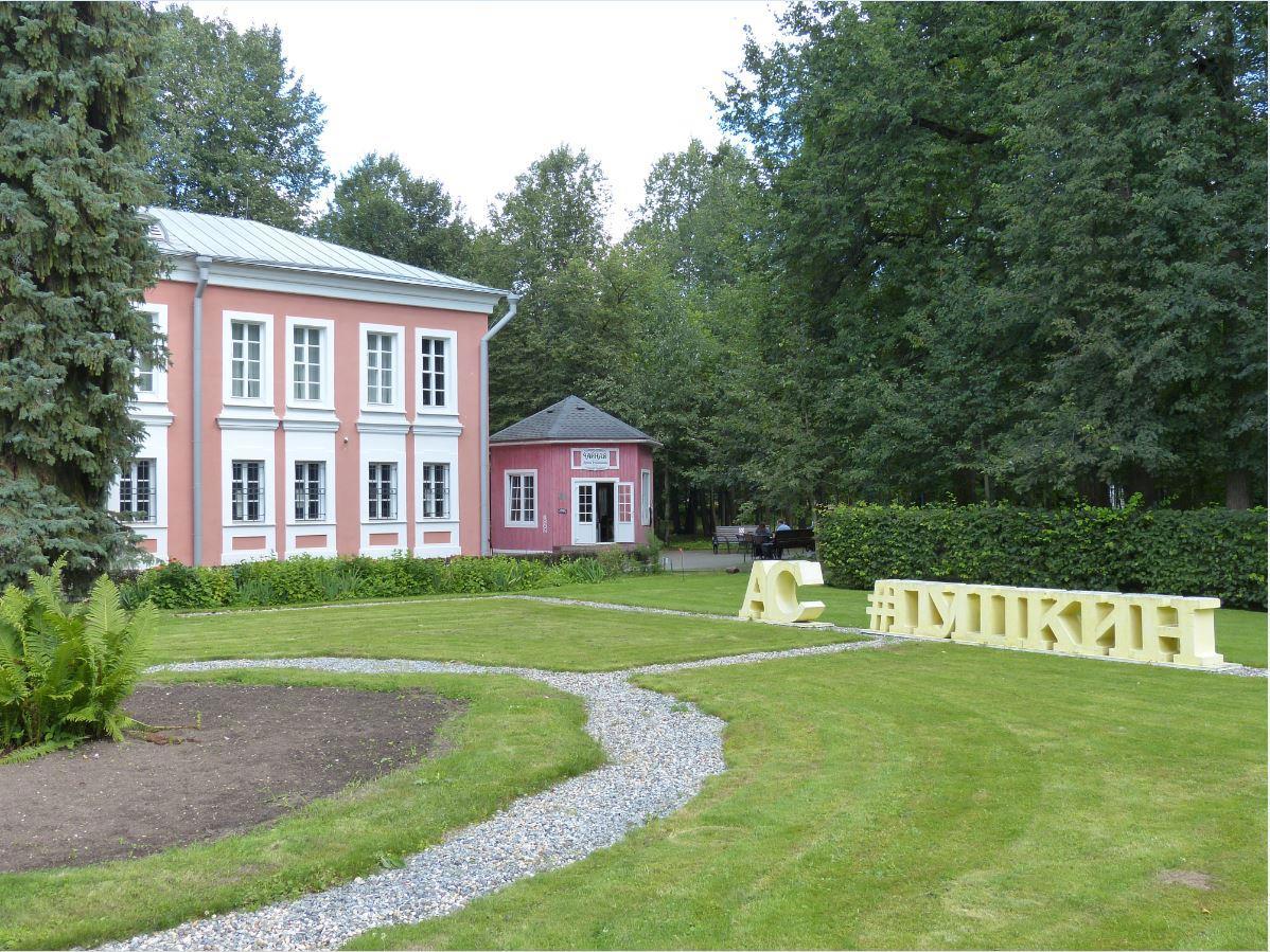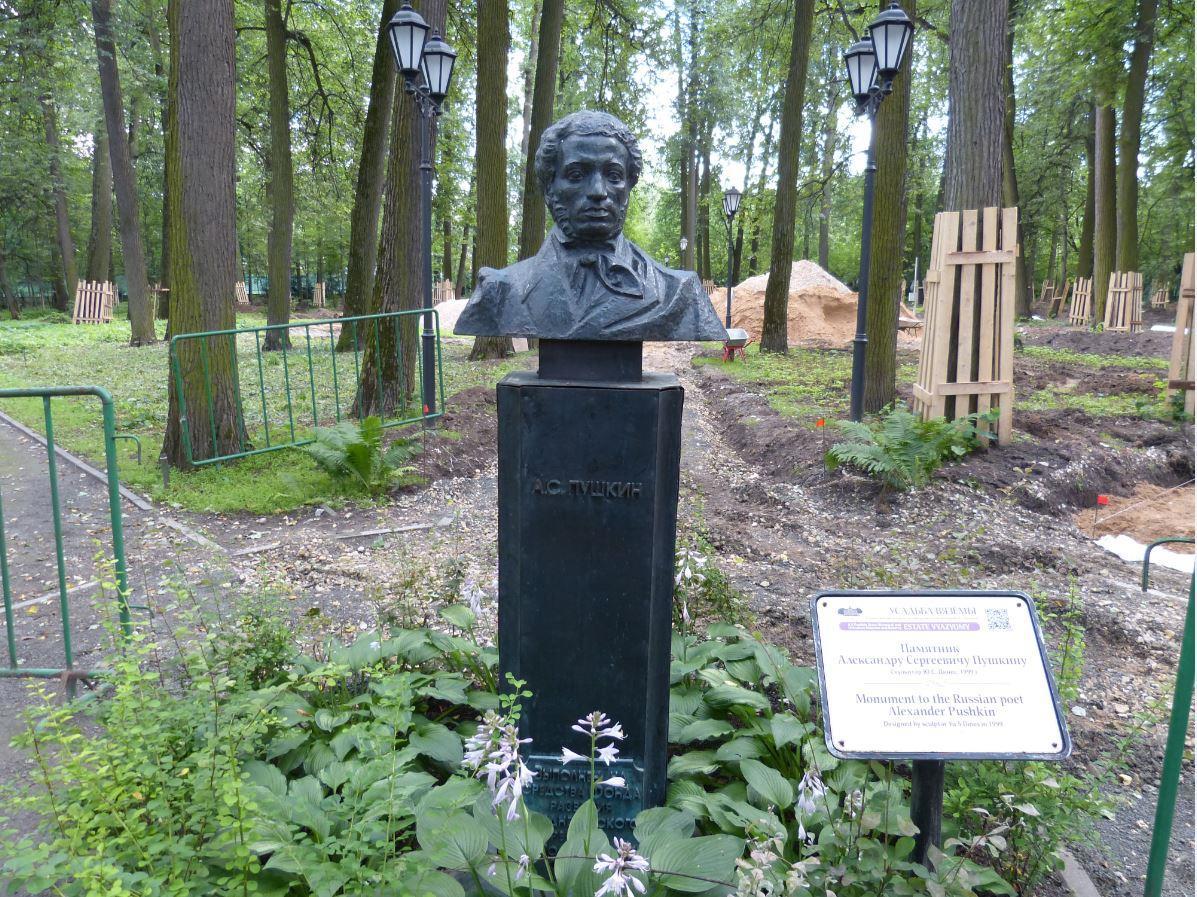 О Пушкине напоминает памятник на аллее перед дворцом,