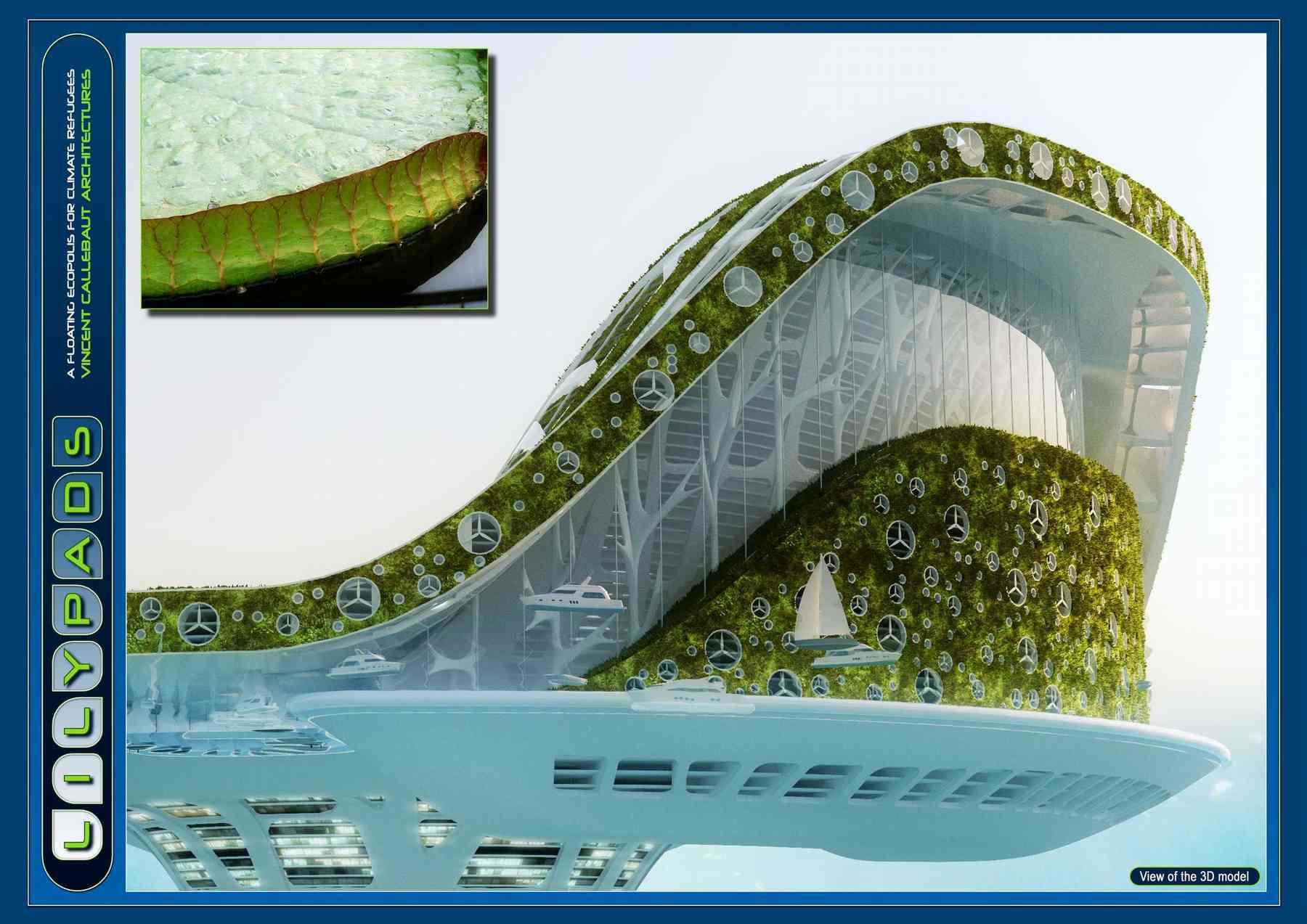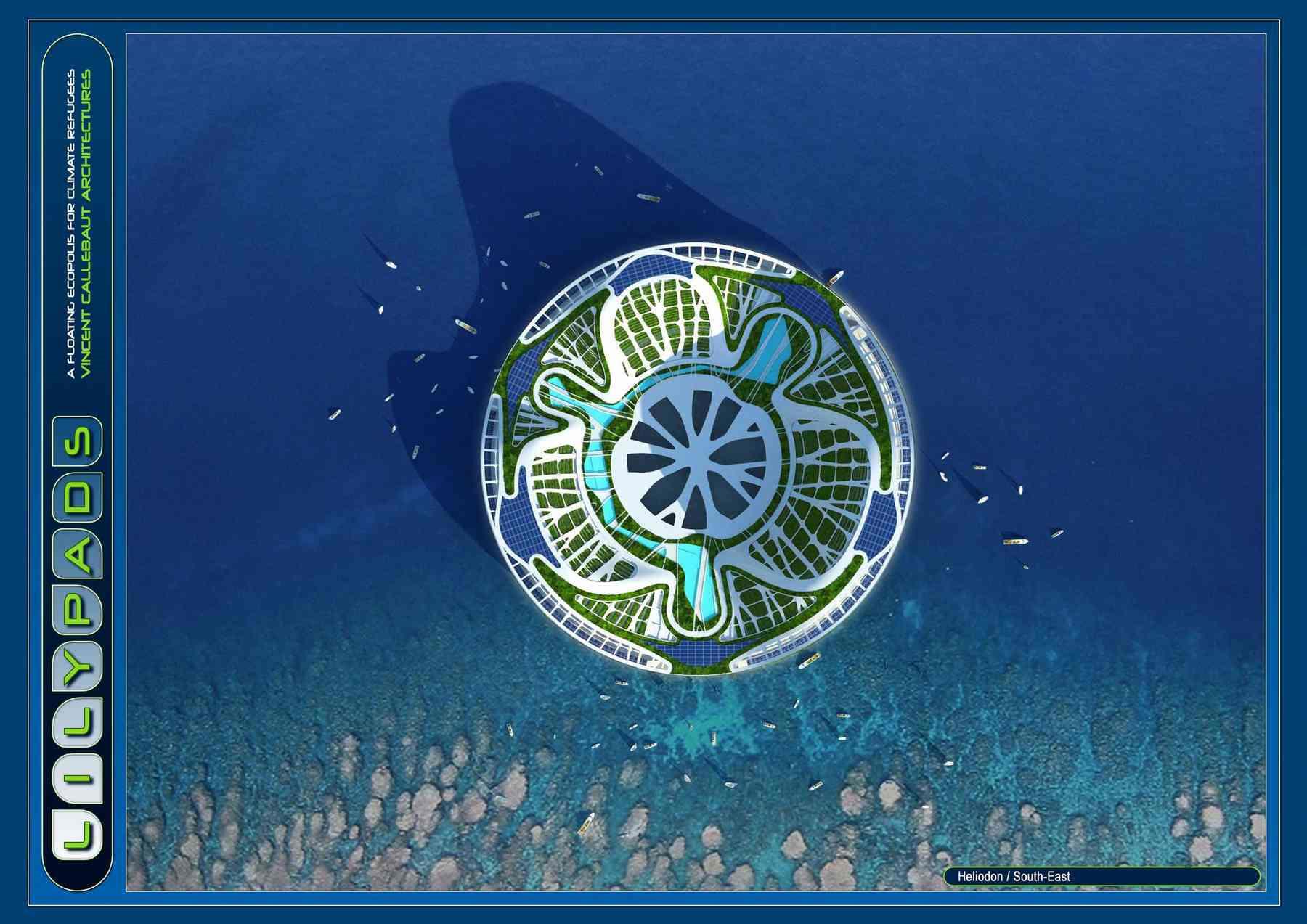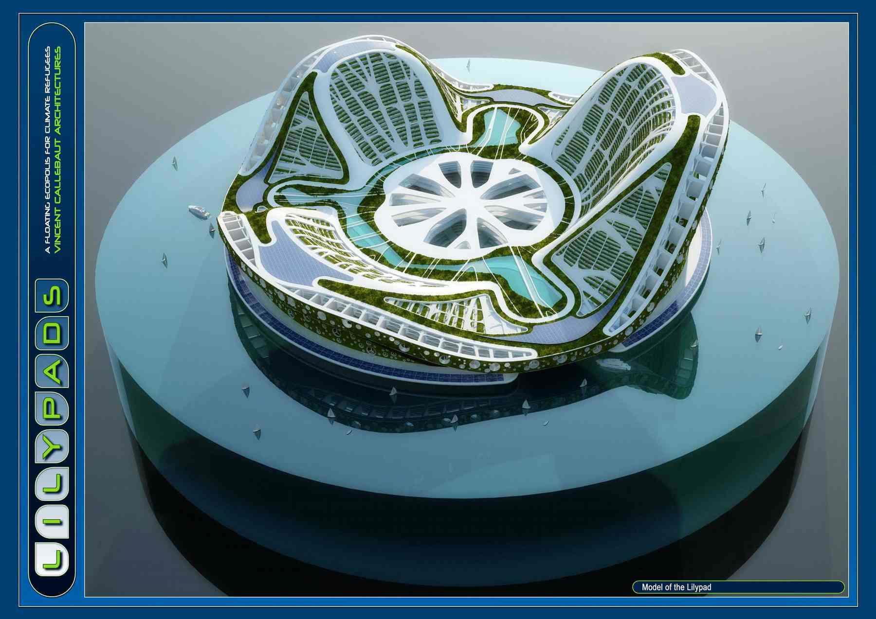 Плавучий экополис, иначе известный как Lilypad, представляет собой модель, разработанную бельгийским архитектором Винсентом Каллебо для будущих климатических беженцев.