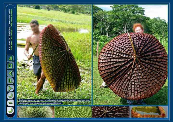 Форма этого плавучего сооружения была вдохновлена сильно ребристым листом водяной лилии Амазонии Виктория Регия.
