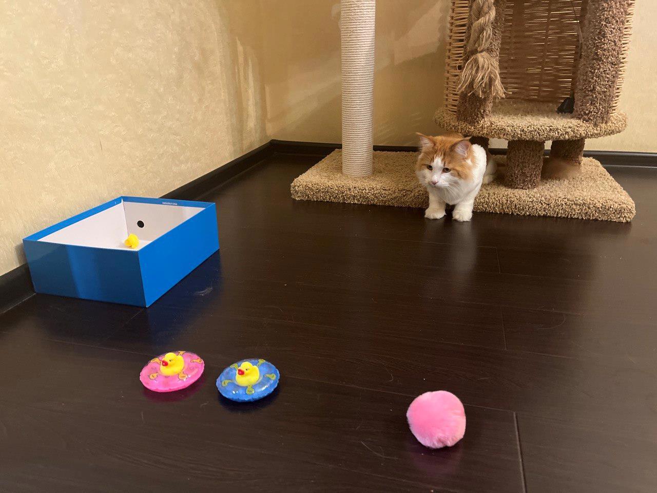 Маленькие утятки немного пришлись по душе и Кнопка играла ими вне ванной комнаты.