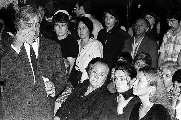 На этом фото - две жены Высоцкого. Вторая жена - Абрамова и рядышком с ней третья - Влади. Ну, а больше всех плачет почему-то главный в театре на Таганке.