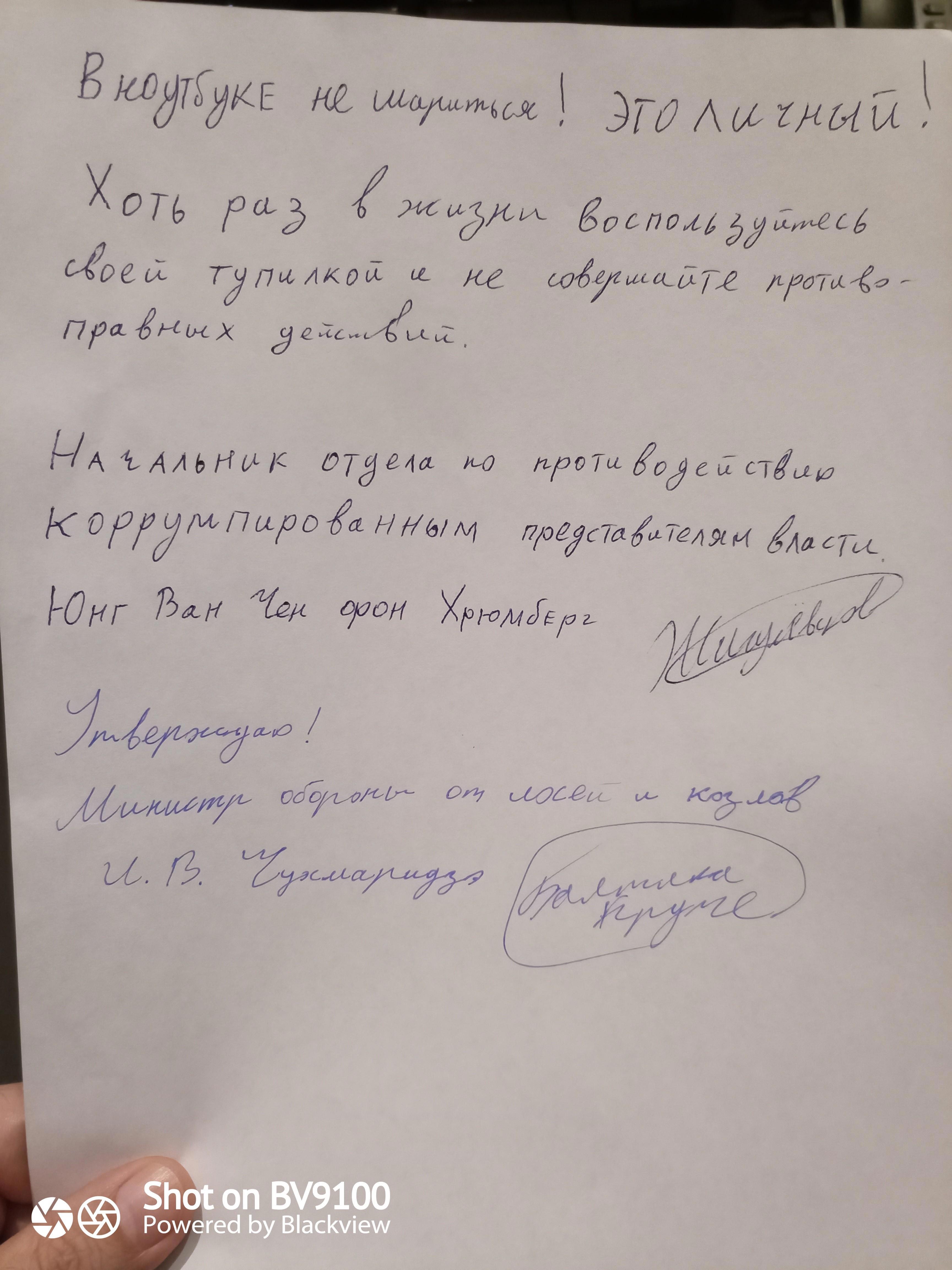 Долго думал, как намекнуть этим "замечательным людям", что копаться в личных вещах некрасиво, а заодно и высказать всё, что я о них думаю. В итоге, теперь всегда в ноуте оставляю им записку, фото прилагаю. Заранее прошу прощения за свой ужасный почерк.