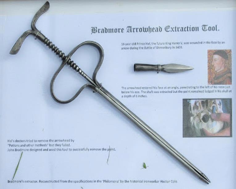 21 июля 1403 года состоялась битва при Шрусбери, в которой будущий король Англии Генрих V, будучи шестнадцатилетним юношей, получает стрелу в лицо, но остается на поле брани практически до самого конца, помогая своему отцу. Когда силы покинули молодого человека и он потерял сознание, его везут в строго охраняемый замок Кенилворт. Во время перевозки древко удаляют, но наконечник застрял в черепе на глубине 15 см. Оставлять нельзя - смерть от инфекции, а попытка извлечь имеющимися средствами - риск моментальной смерти. В итоге решение нашел лондонский хирург Джон Брэдмор, который позже написал целый трактат об изобретенном им лечении "Филомена". В кратчайшие сроки им были изобретены, изготовлены и применены щипцы, которыми Брэдмор сумел аккуратно вытащить наконечник из головы Генриха. Надо ли говорить, что рану затем успешно вылечили.