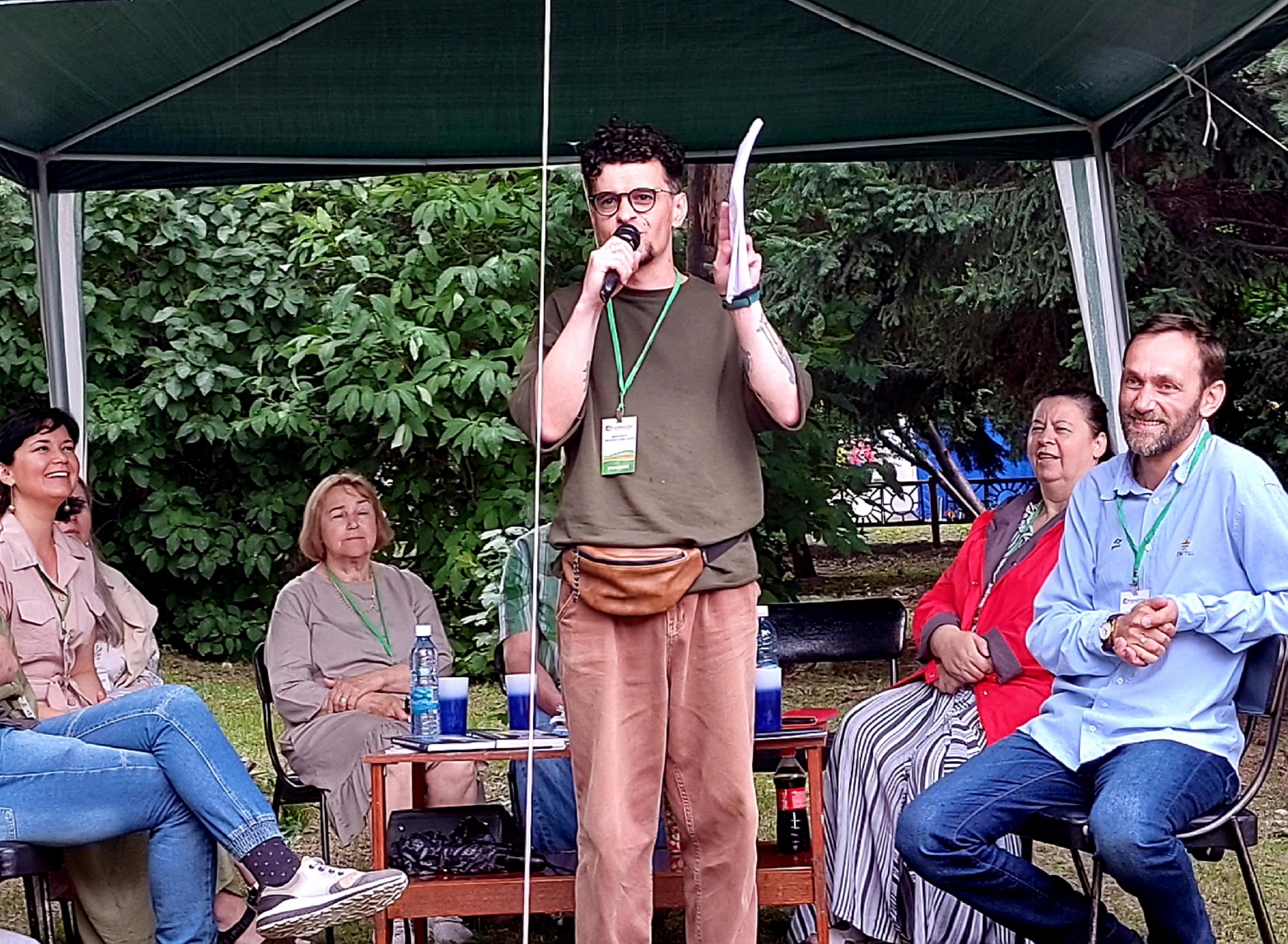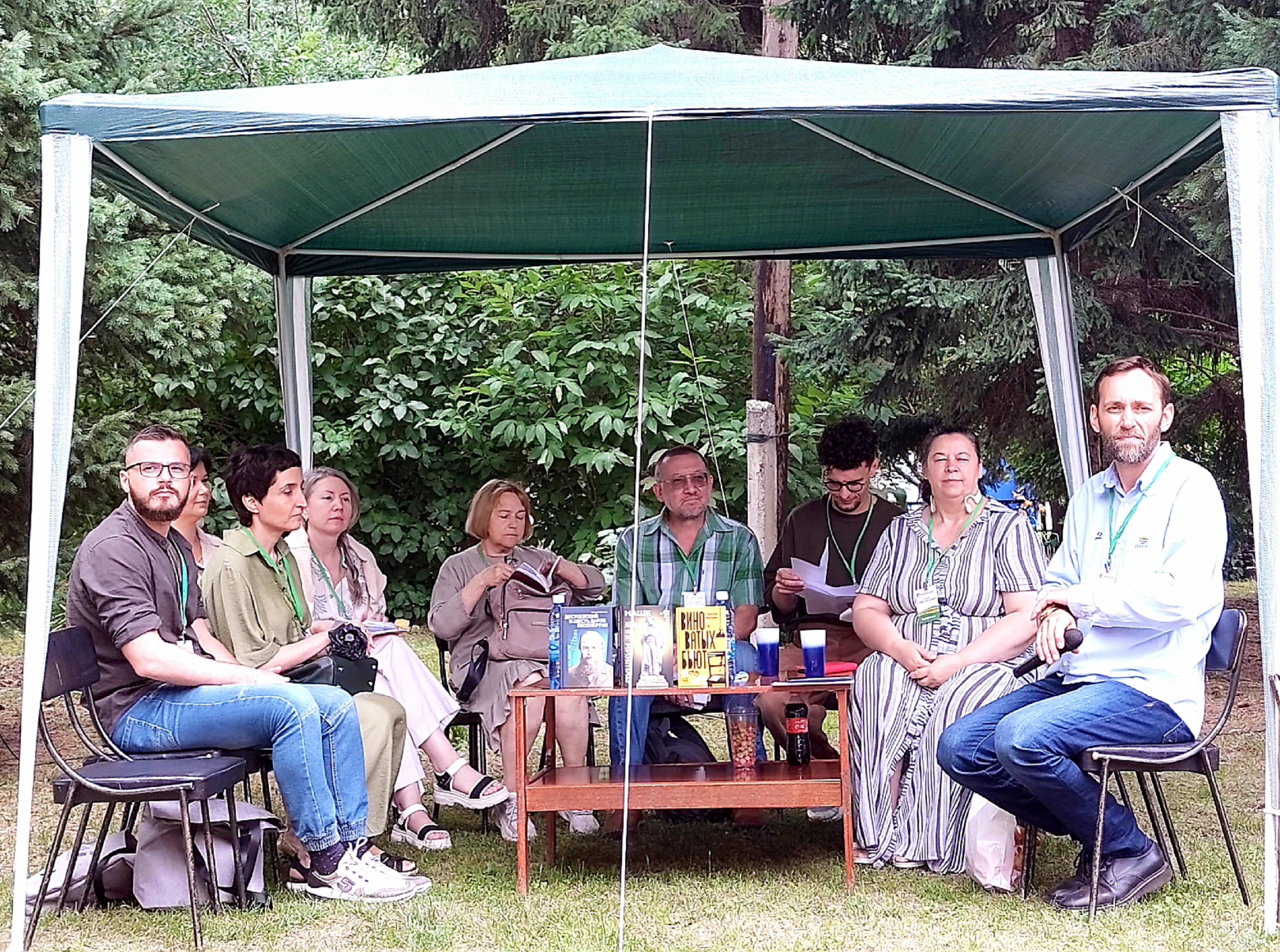 Писательская палатка (слева направо): Сергей Кубрин (Пенза), Мария Базалеева (Москва), Гаянэ Степанян (Москва), Нина Орлова-Маркграф (Москва), Владимир Елистратов (Москва), Михаил Левантовский (Санкт-Петербург), Анна Самойлова (Барнаул), Иван Образцов (Барнаул).