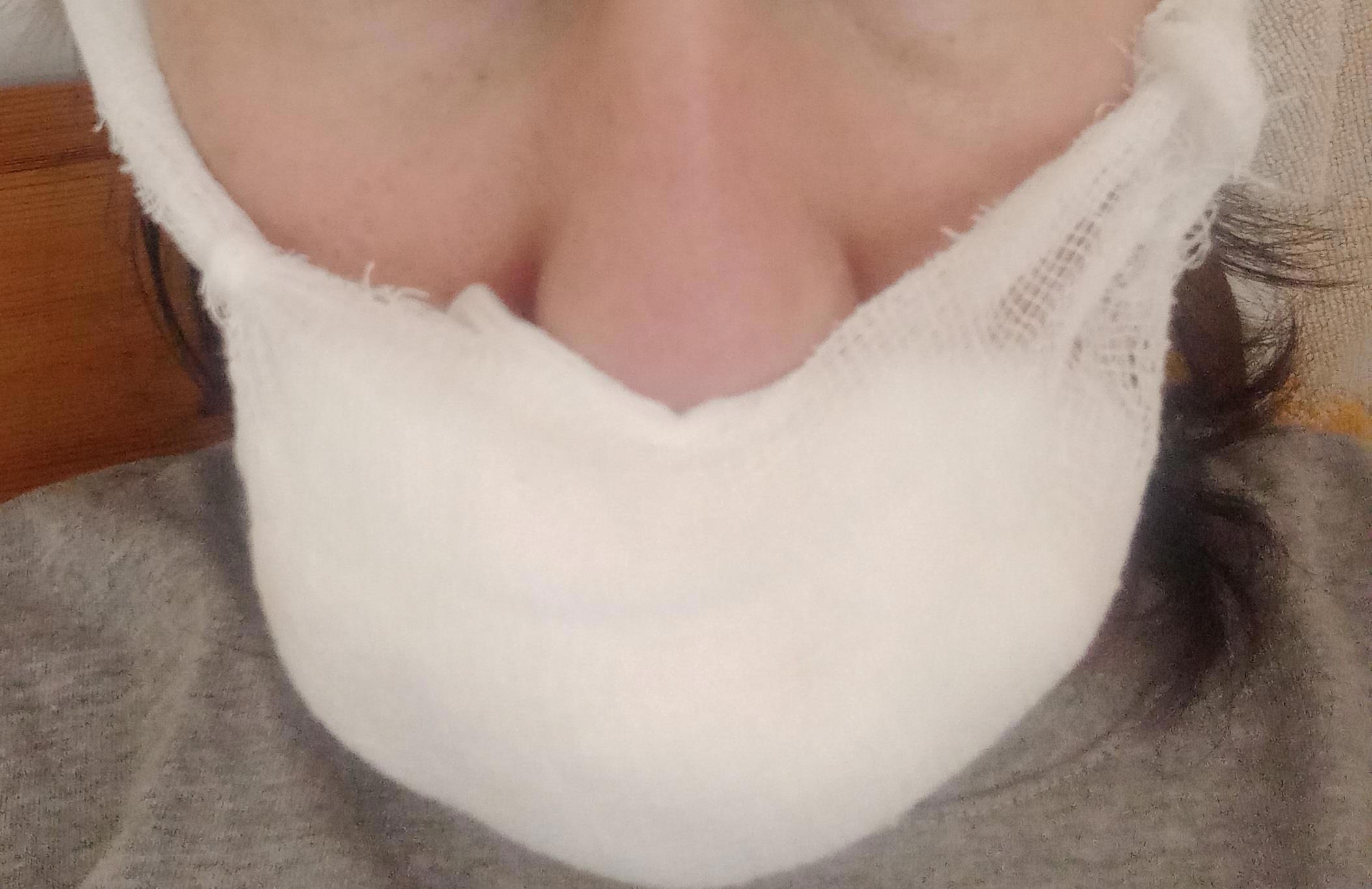 Нос не болел. Просто кровил, поскольку там было иссечено много патологически разросшихся тканей. Естественно, сосуды кровоточат. Сначала мне показалось, что нос сильно разнесло, потому что он выглядел втрое шире. Потом я разобралась: это потому, что туда напихали много бинтиков. А сверху висела эта бинтово-ватная бандура.