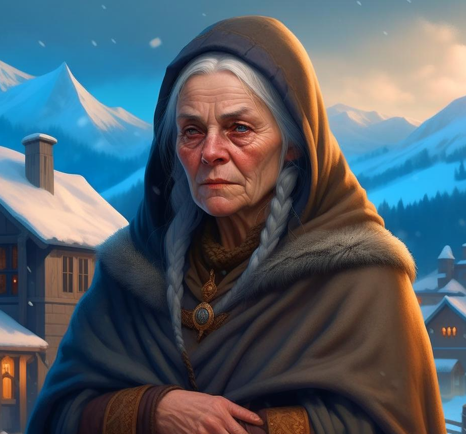 Внешность: статная высокая дама с длинными седыми косами, уложенными по клановому обычаю, носит темные одежды жрицы Гримурха