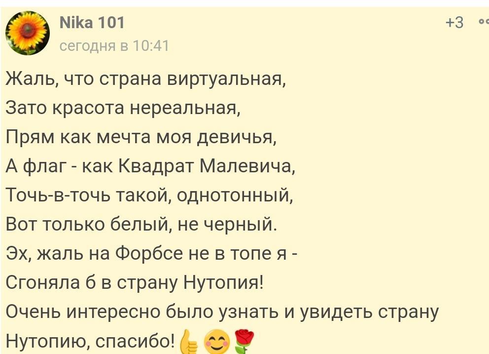 Мы объявляем об основании страны Нутопии. Гражданство страны может быть получено путем объявления вашей тяги к Нутопии. У Нутопии нет территории, нет границ, нет паспортов, только люди. В Нутопии нет законов, кроме космической программы. Все люди, проживающие в Нутопии, являются послами страны. Как два посла Нутопии, мы просим признания в Организации Объединенных Наций нашей страны и её народа.