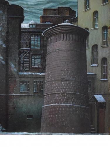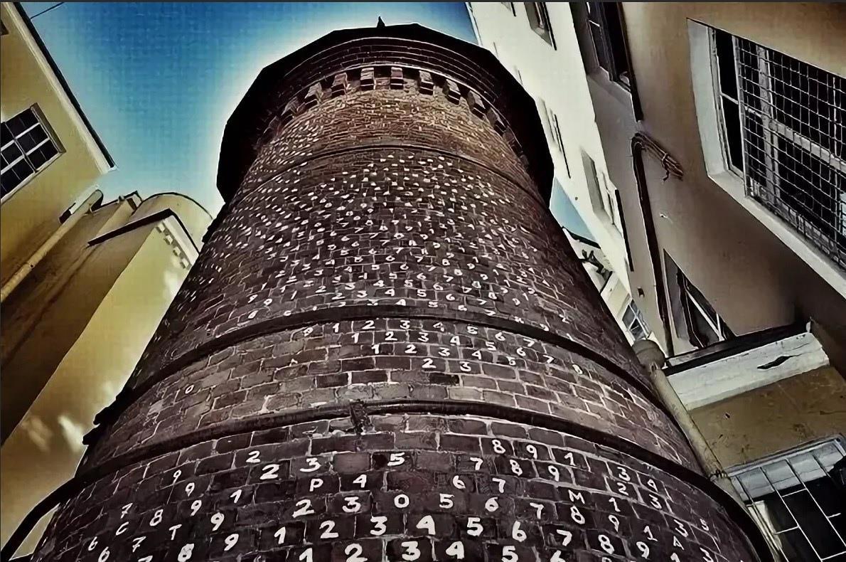 Считается, что это труба лаборатории знаменитого в старом Петербурге фармацевта Вильгельма Пеля. Он занимался алхимией, умел превращать ртуть в золото, вывел формулу счастья, а для охраны своих тайн создал грифонов, которые до сих пор по ночам летают над городом: иногда их отражения видны в окнах соседних домов. Цифры же, написанные на кирпичах – это зашифрованный код Вселенной. Тому, кто его сочтет, сулится исполнение всех желаний. Правда цифры эти время от времени сами собой меняются.