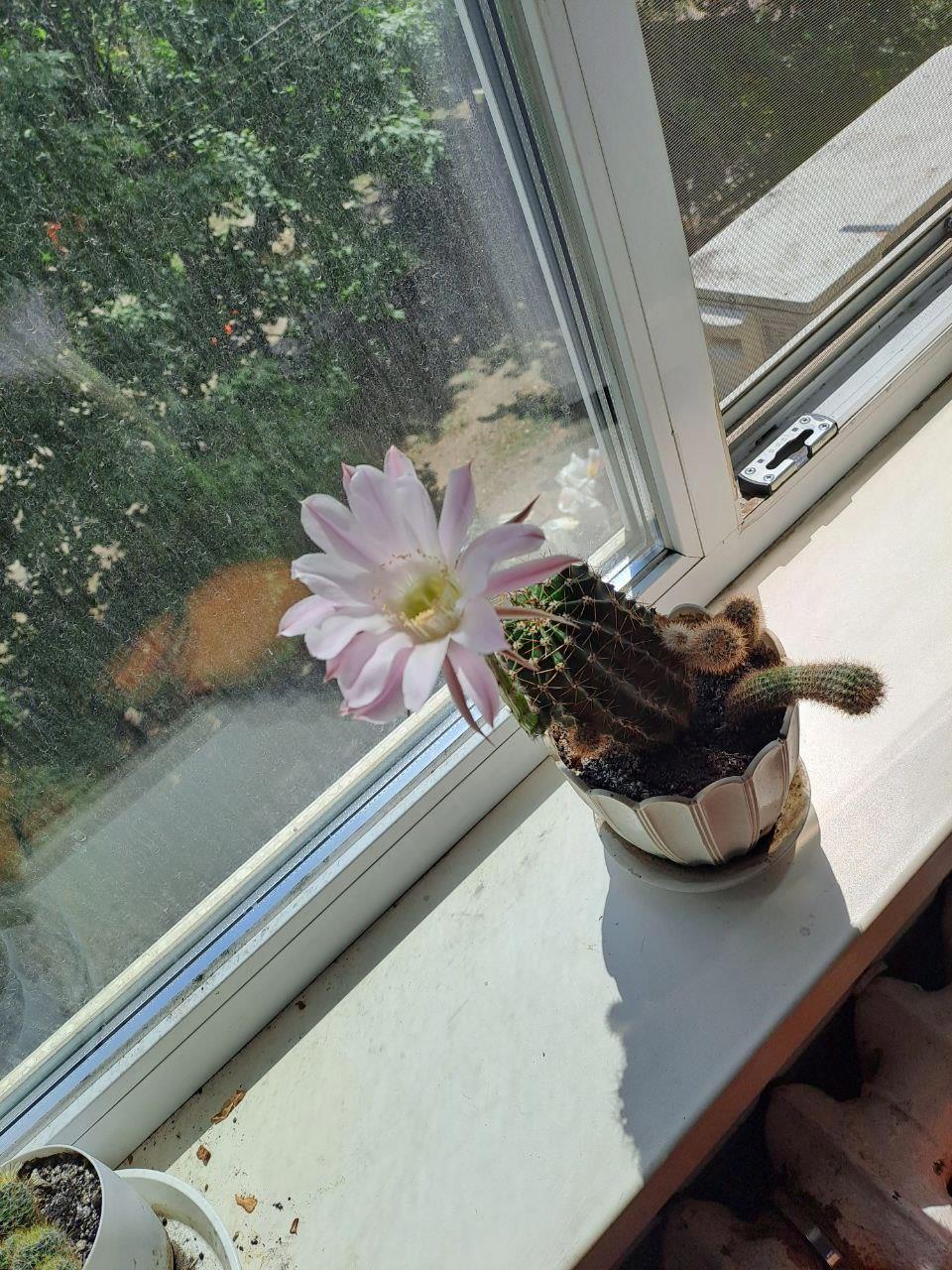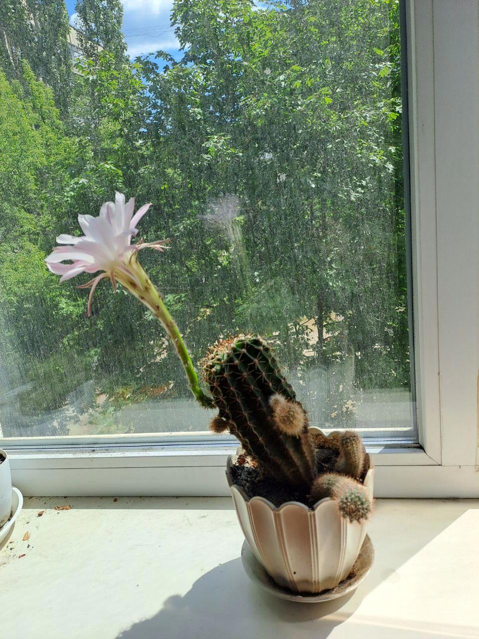Породистый кактус в основном сгнил, но отросток выжил и теперь бодро отъедается, единолично владеет большим горшком.