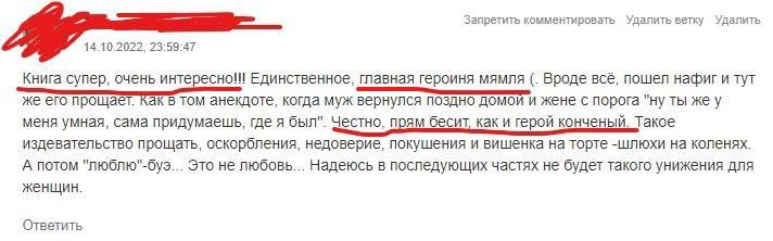 Но не всякий негативный комментарий критика. Я удаляю ересь вроде "Ой, баба хрень какую-то написала", "Аннотация дебильная", "Обложка убогая". Если у входной двери есть коврик, это не значит, что на него можно безнаказанно гадить.