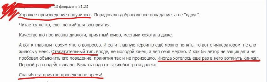 В общем, не буду утомлять, таких комментариев было много. И я переделывала-переделывала, пока пальцы до кровавых мозолей не стёрла. Но всё -- десятый раз юбилейный. Больше не буду старый текст трогать. Самое забавное, что и ругают, и хвалят примерно за одно и то же.