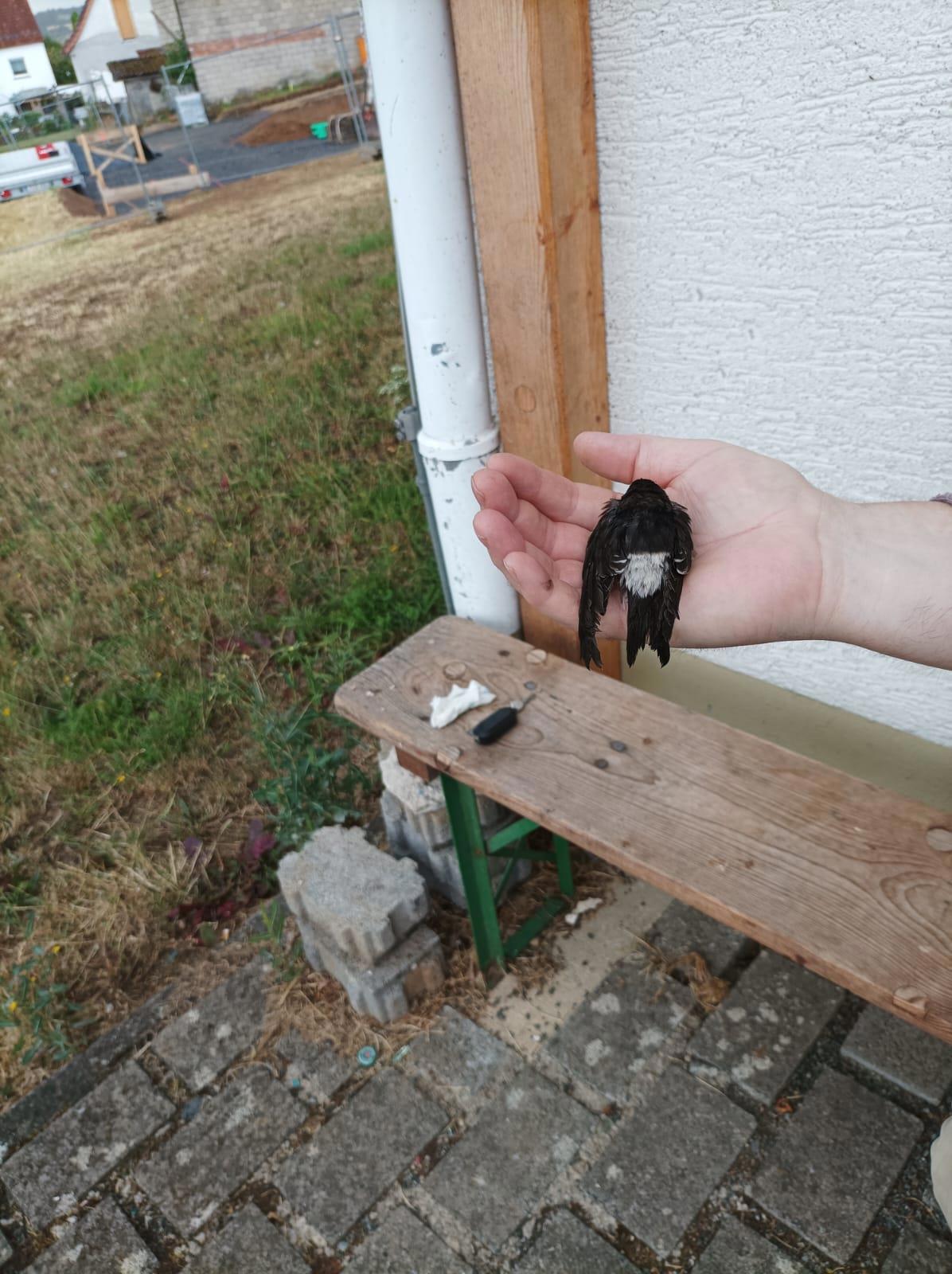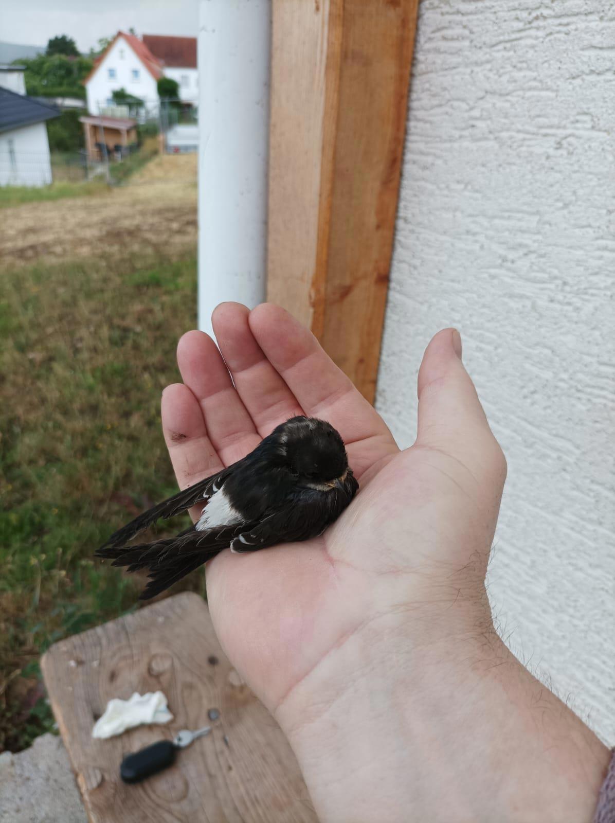 Пошёл дождик, и птичка упала на травку. Не долго думая, муженёк приостановил все работы, чтоб птенца рабочие не задавили, а потом начал сушить несчастного. Высушил. Выпустил, а он опять упал. Забрался на дерево, посадил тудась. Птенчик полетел и шмякнулся на крышу, но там уже его родители наконец-то нашлись, и сынка взяли в свои объятья, накормили, и вместе улетели.