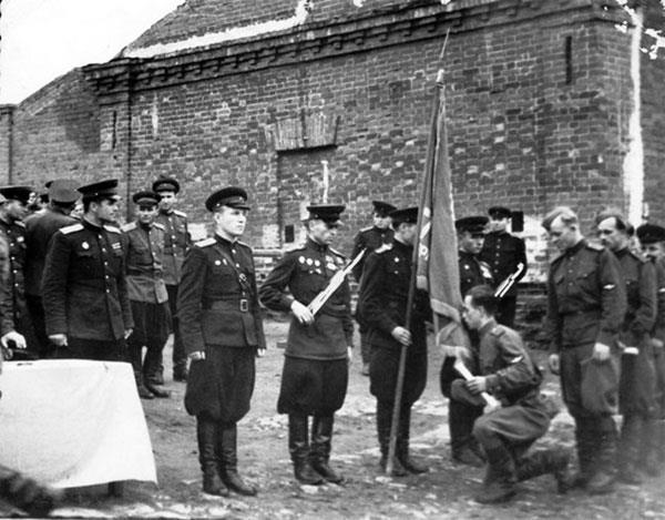 1950 г. Прощание со Знаменем полка. Увольнение последней партии солдат-фронтовиков, которые прослужили 7 лет. На полотнище знамени видна цифра 7 - в полку было Боевое Знамя 7-й гв. вдбр.