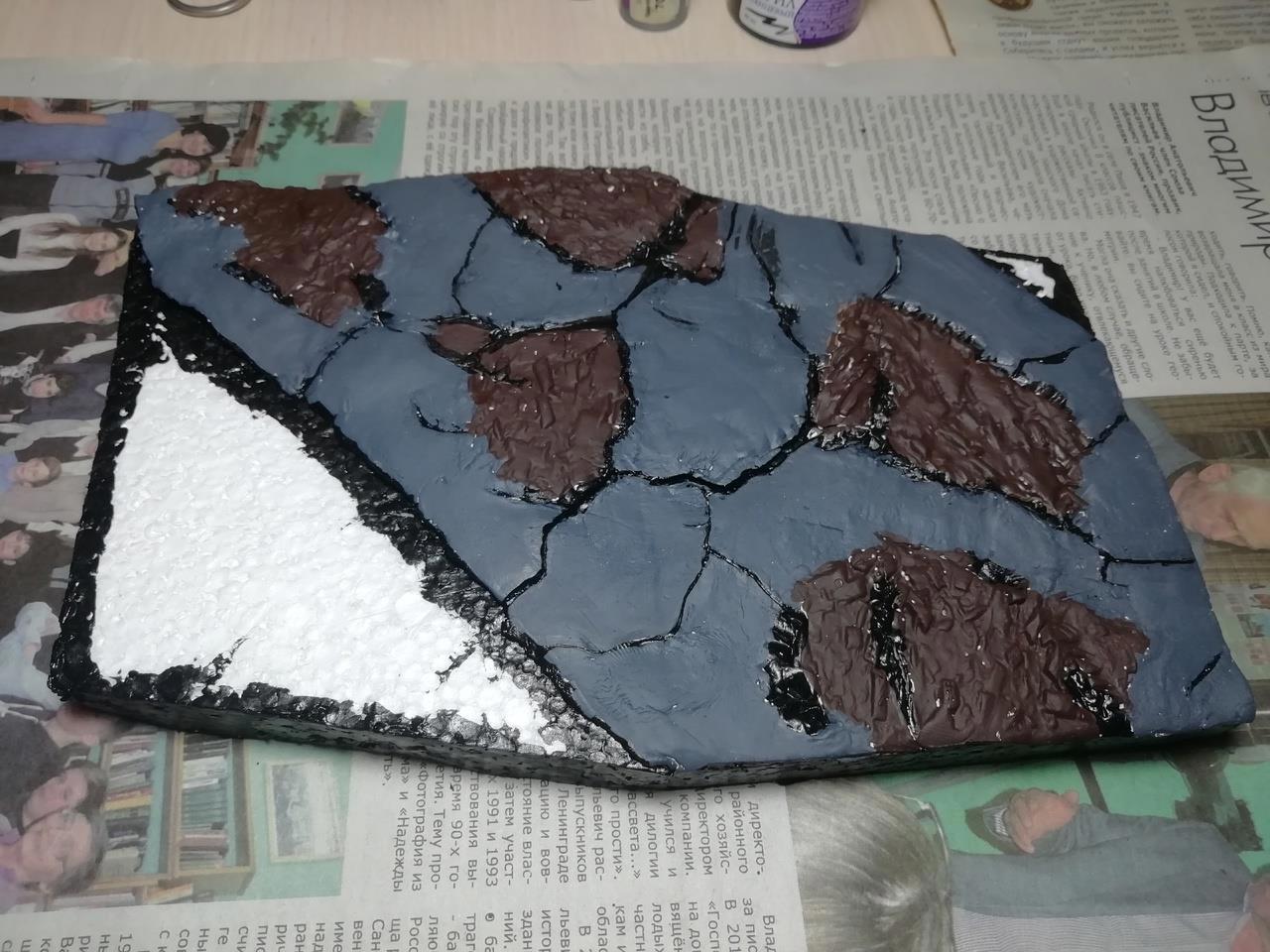 А вот попытка сделать из полимерной глины битый асфальт с засыпанными ямами. В первом приближении - пока накрашено только базовыми цветами: