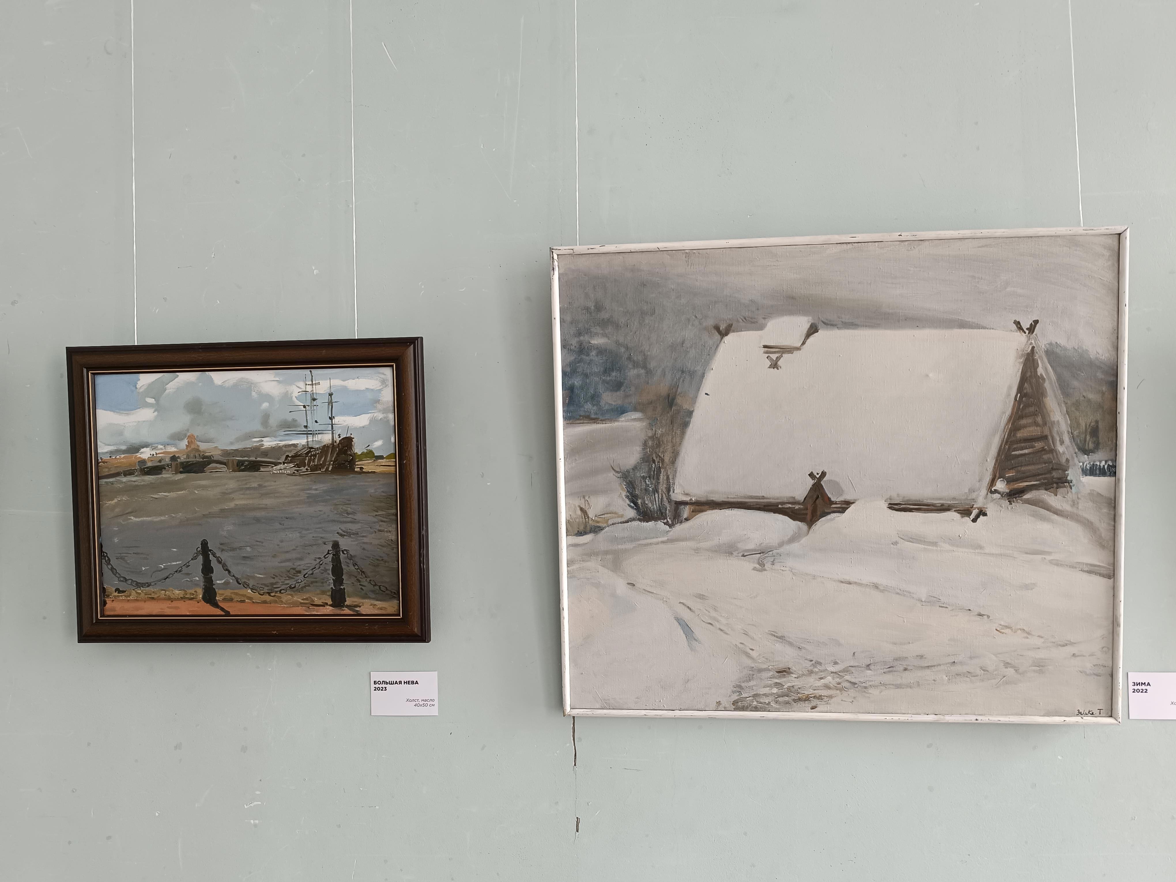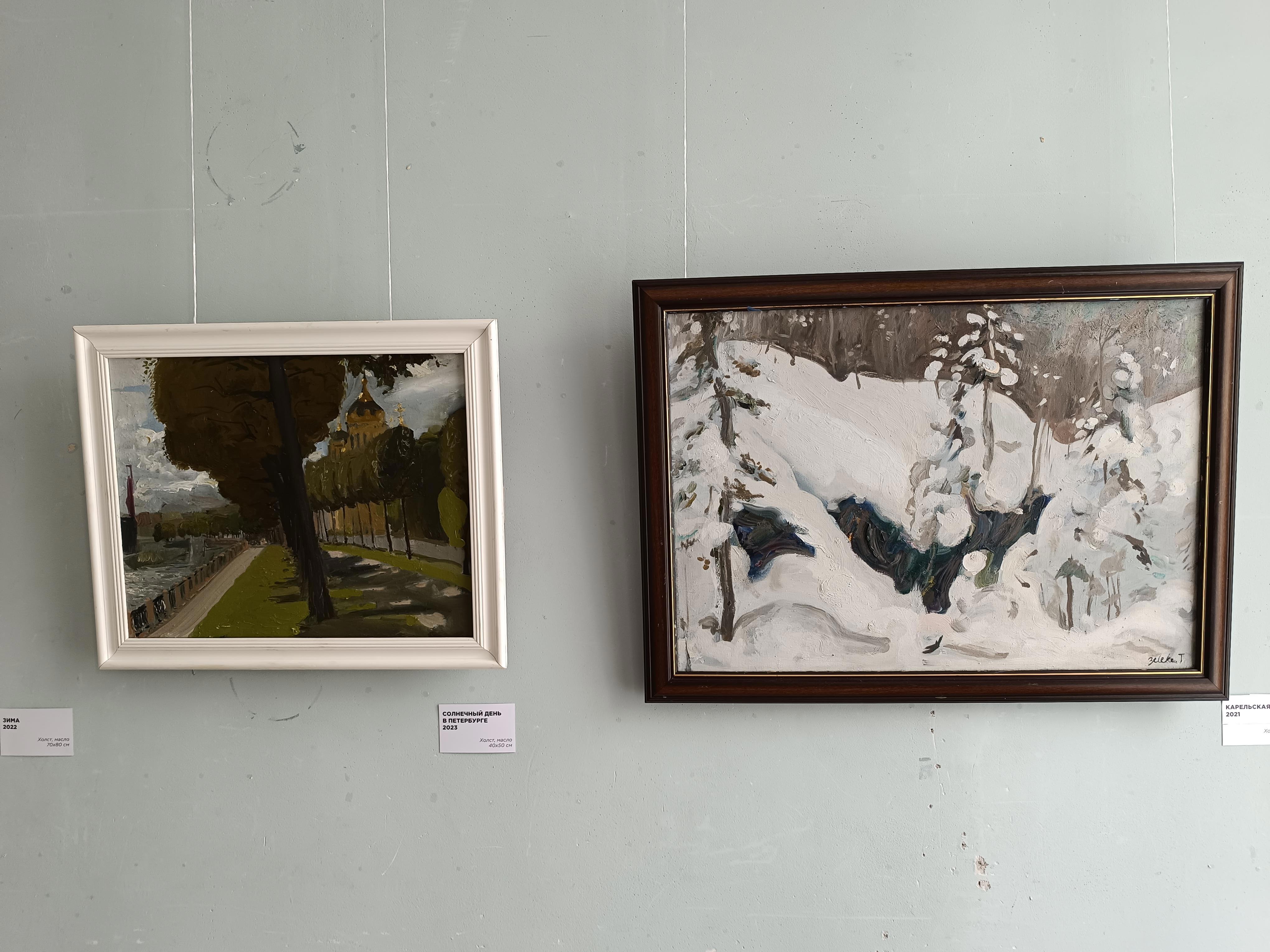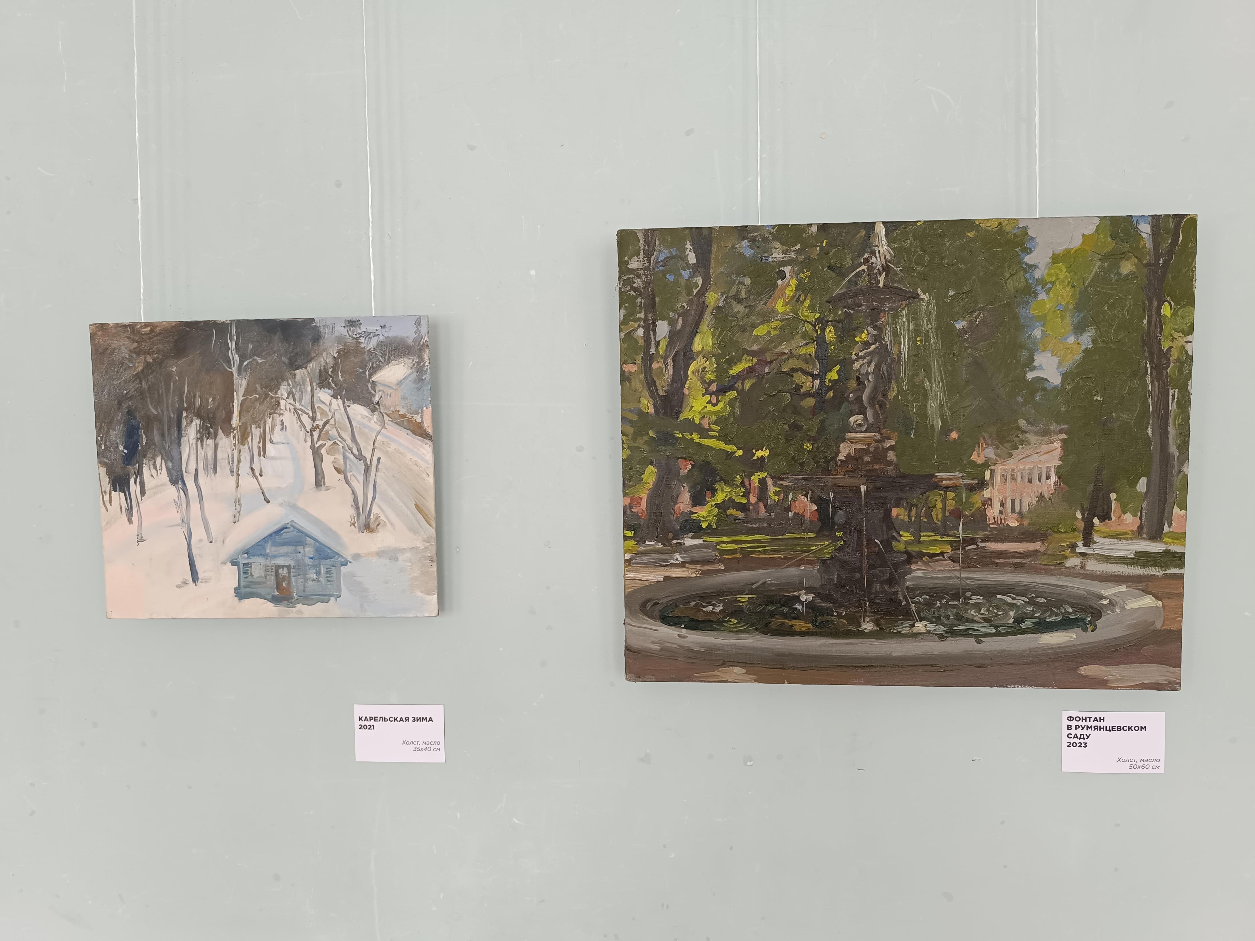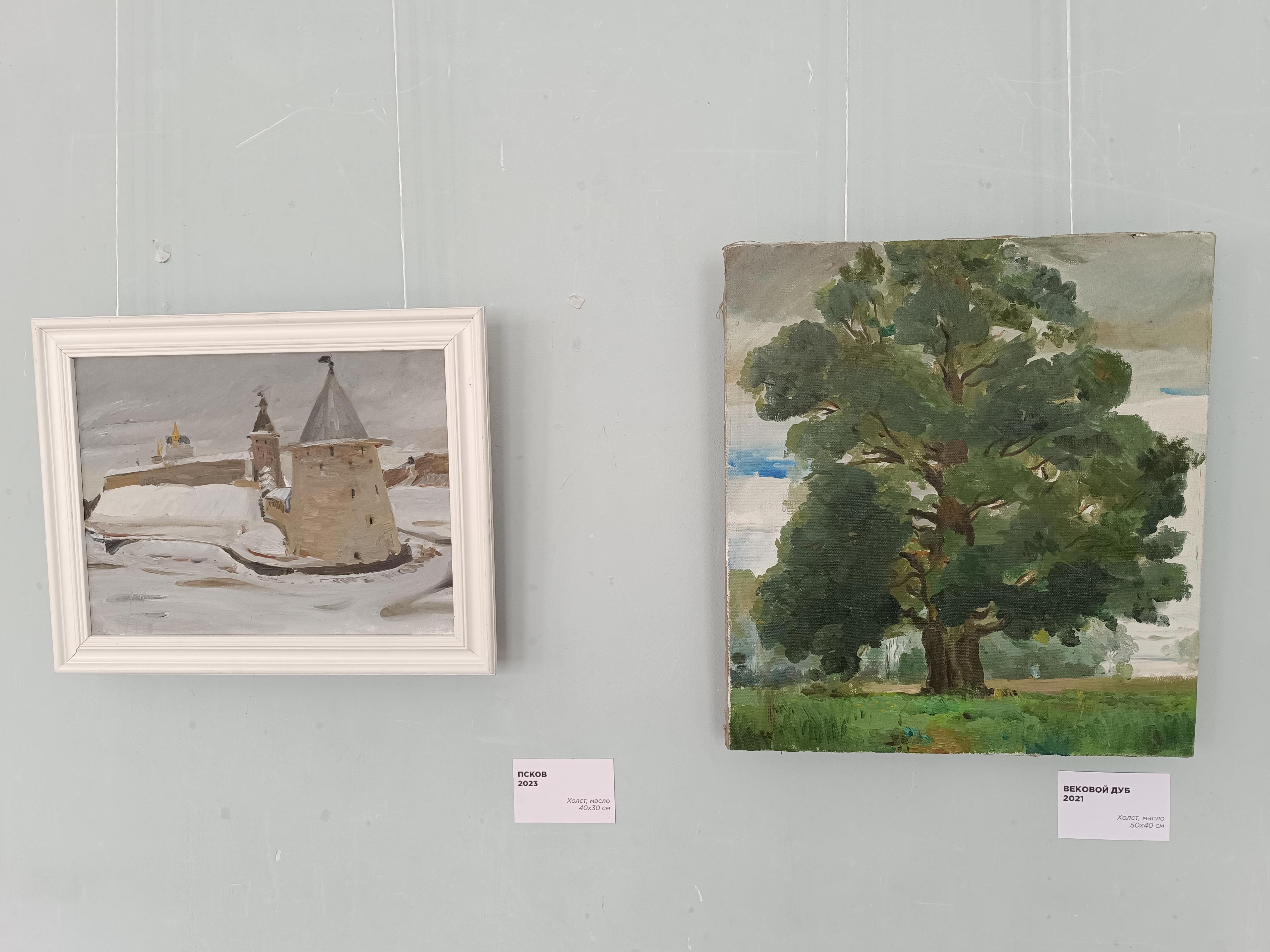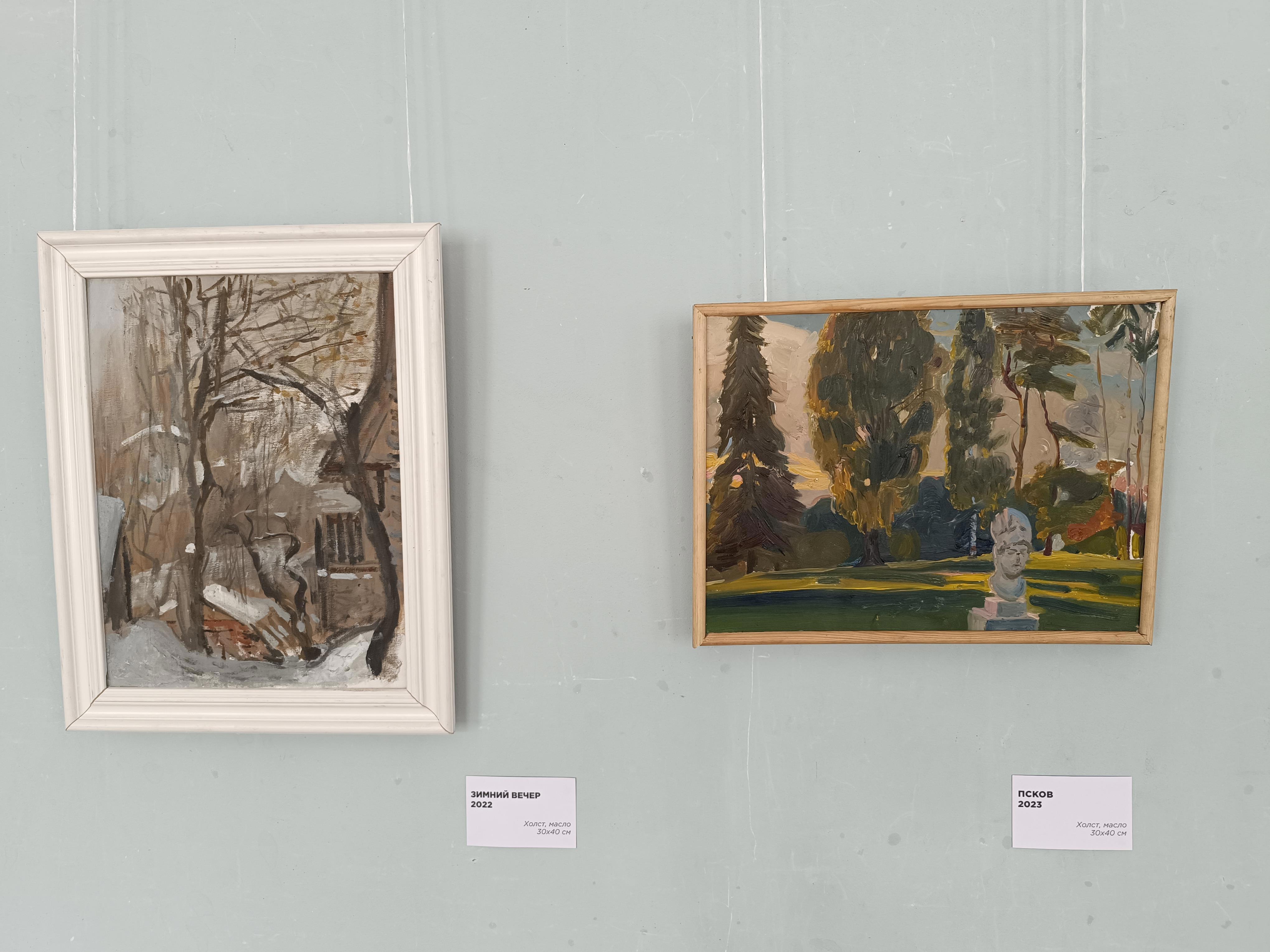 Его любимая тема - русская зима, мир, где белый цвет имеет множество оттенков и создает особенный колорит. На пленэре в Пскове и Изборске художник писал сугробы, заснеженные храмы и дома в монохромной палитре. Но также на выставке есть и летние картины, хотя их колорит тоже весьма строг и элегантен.