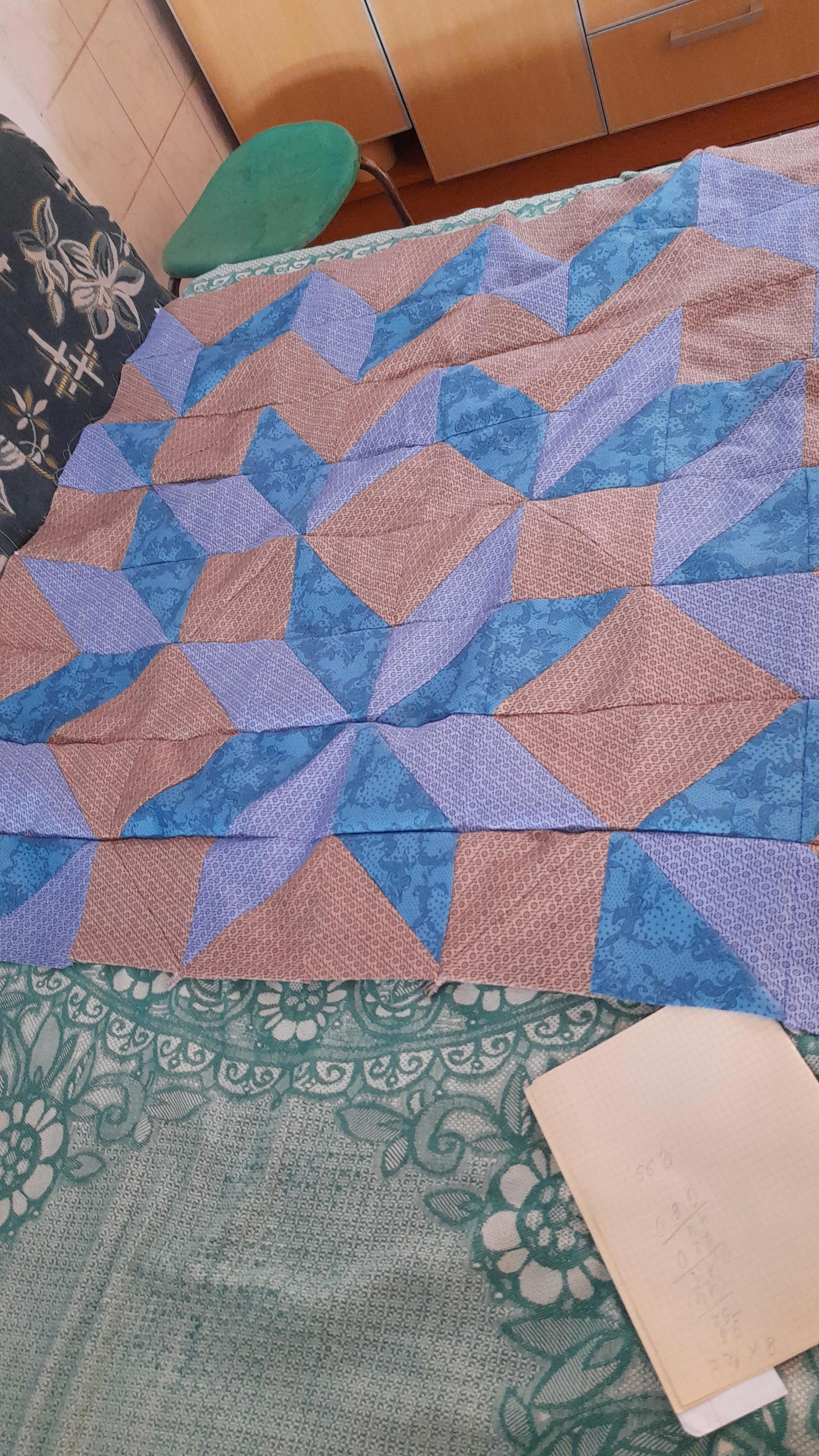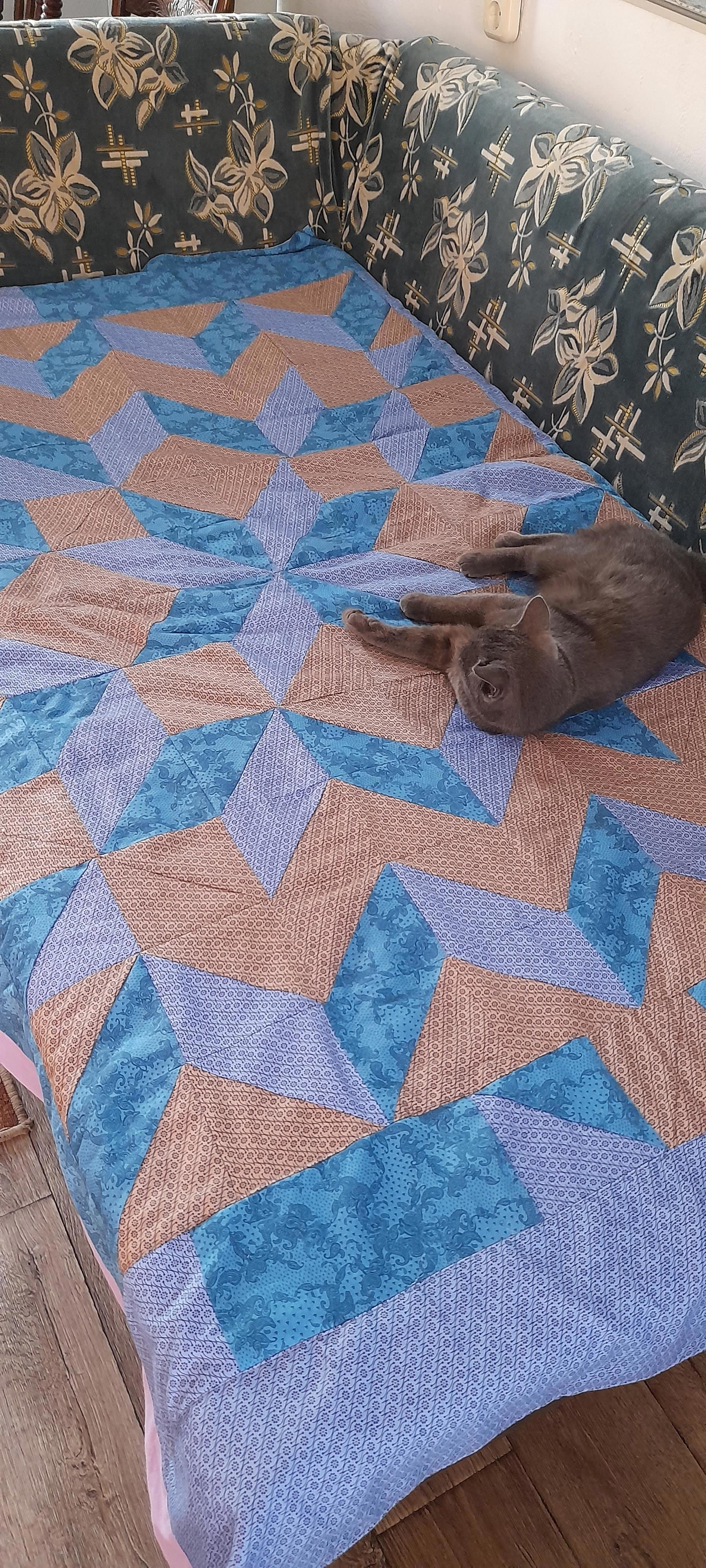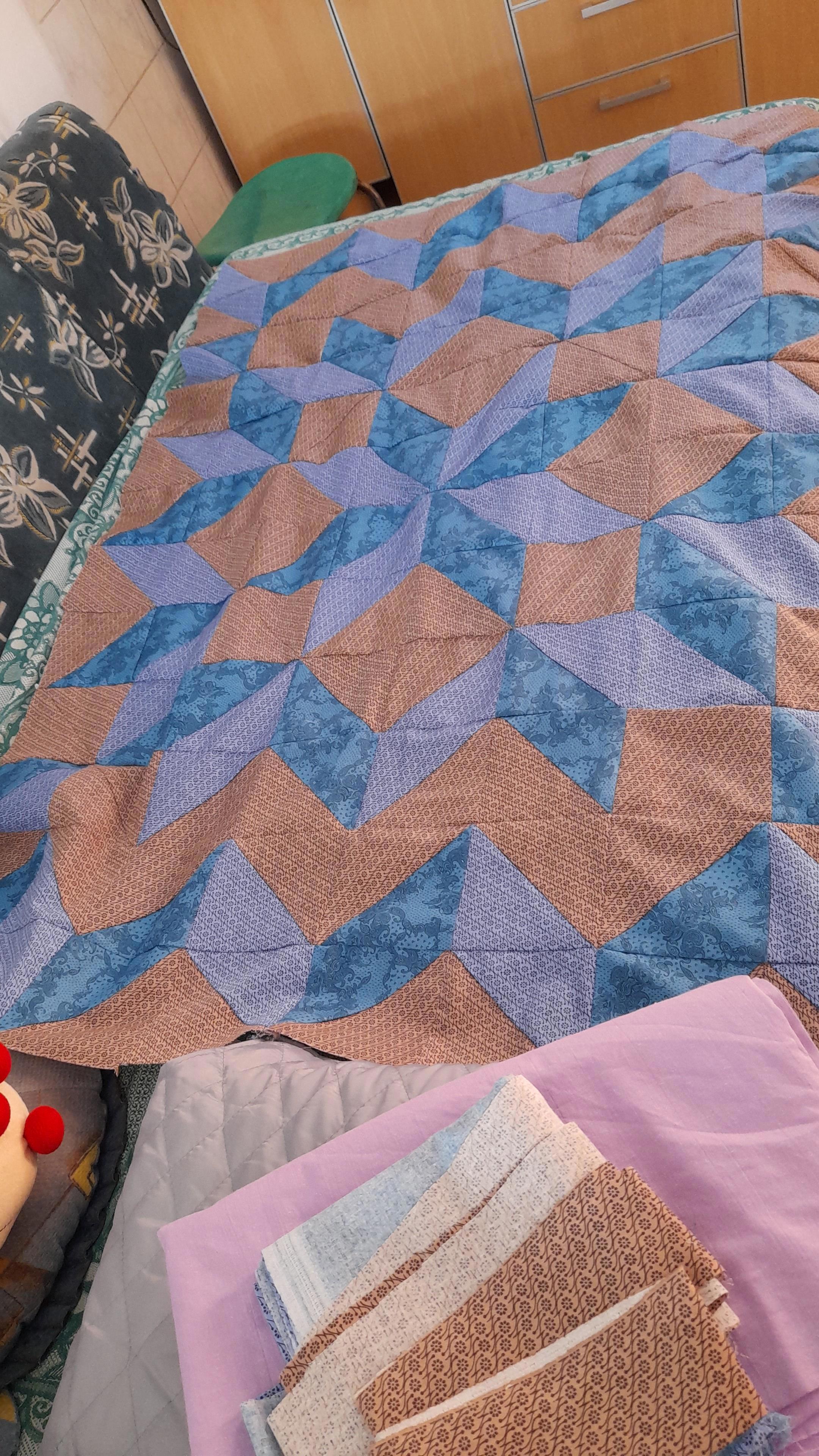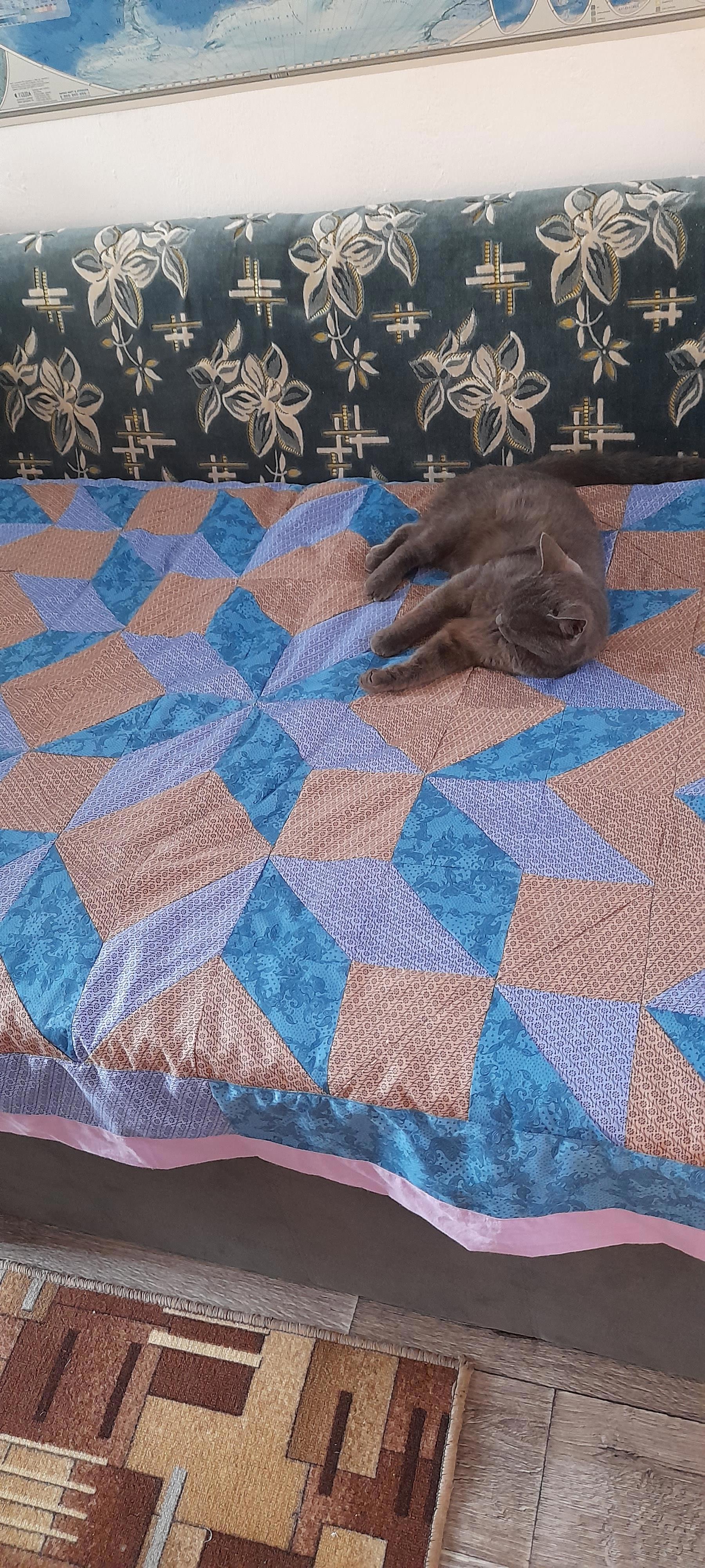 Оказывается это не так долго, как я думала, вместе с раскроем у меня ушло примерно около шести часов на покрывало размером 1,40 на 2 метра. Процесс шитья залипательный, теперь думаю наволочку в тон покрывалу пошить. Как раз подушка без наволочки есть.