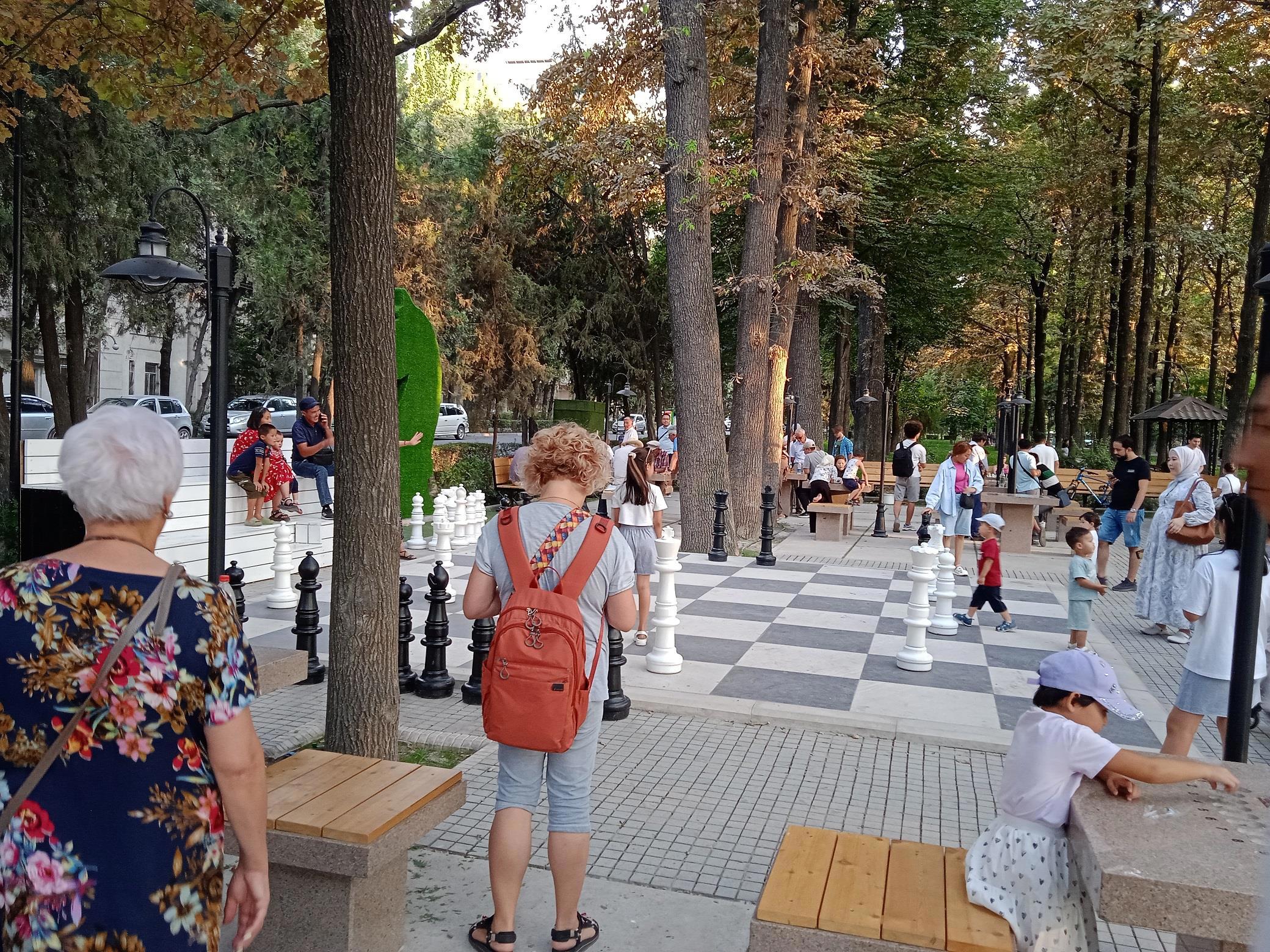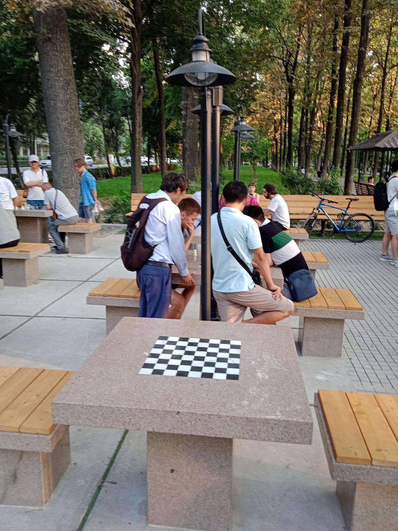 Автор: Руслан БирюшевКраем уха я слышал, что у нас в Бишкеке открылась некая "Шахматная аллея", а недавно по оказии и очутился вблизи этого места. Прямо в один из городских бульваров врезался маленький рай для шахматистов - судя по табличке, оборудованный одной из столичных коммерческих фирм в подарок городу. Огромные напольные шахматы, мраморные шахматные столы и подвижные шахматные столики, скользящие вдоль длинных скамеек, опоясывающих скверик. Но самое удивительное - толпы народу, действительно играющего в шахматы. И пенсионеры, и дети, и люди средних лет - все кучковались вокруг столов, играя лично или наблюдая за партиями. Отдельно отмечу уютные фонарики над столами, благодаря которым играть можно и летними вечерами после заката - благо, летом город засыпает поздно.