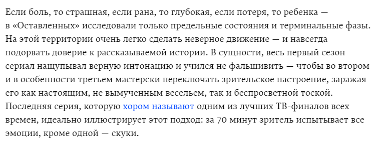 Ну и дальше нам показывается, как это исчезновение отразилось на судьбах конкретных людей. Но за частными драмами и трагедиями проступает намного более глубокая тема - исследование человечности. Где-то к 7 серии 1 сезона я наконец-то въехал в это. И понял, почему я его смотрю и не могу оторваться не меньше, чем от какого-нибудь остросюжетного блокбастера.
