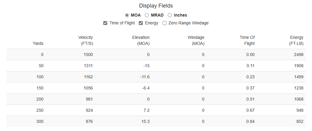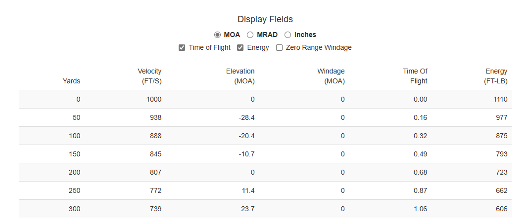 Вопреки представлениям отдельных личностей, на 300 ярдов круглая пуля, вылетающая из ствола на скорости 450 м/с привезет вполне достаточно энергии, хорошо за 1000 джоулей (в таблице энергия в футо-фунтах)