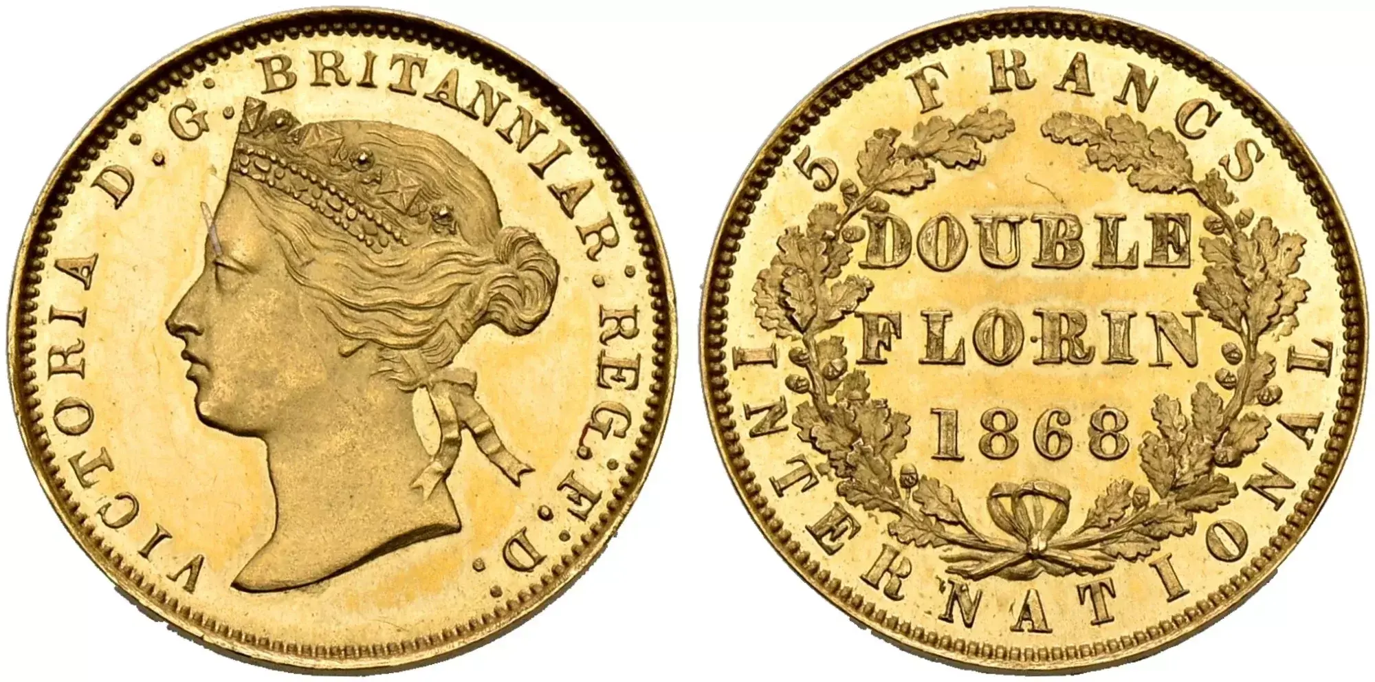 Одна из британских попыток создать торговую монету с двумя номиналами - 2 флорина=5 франкам