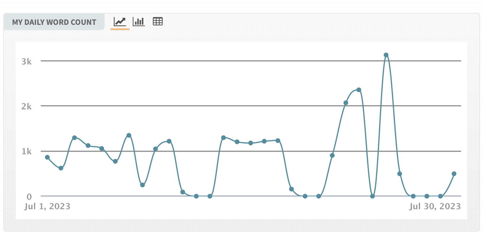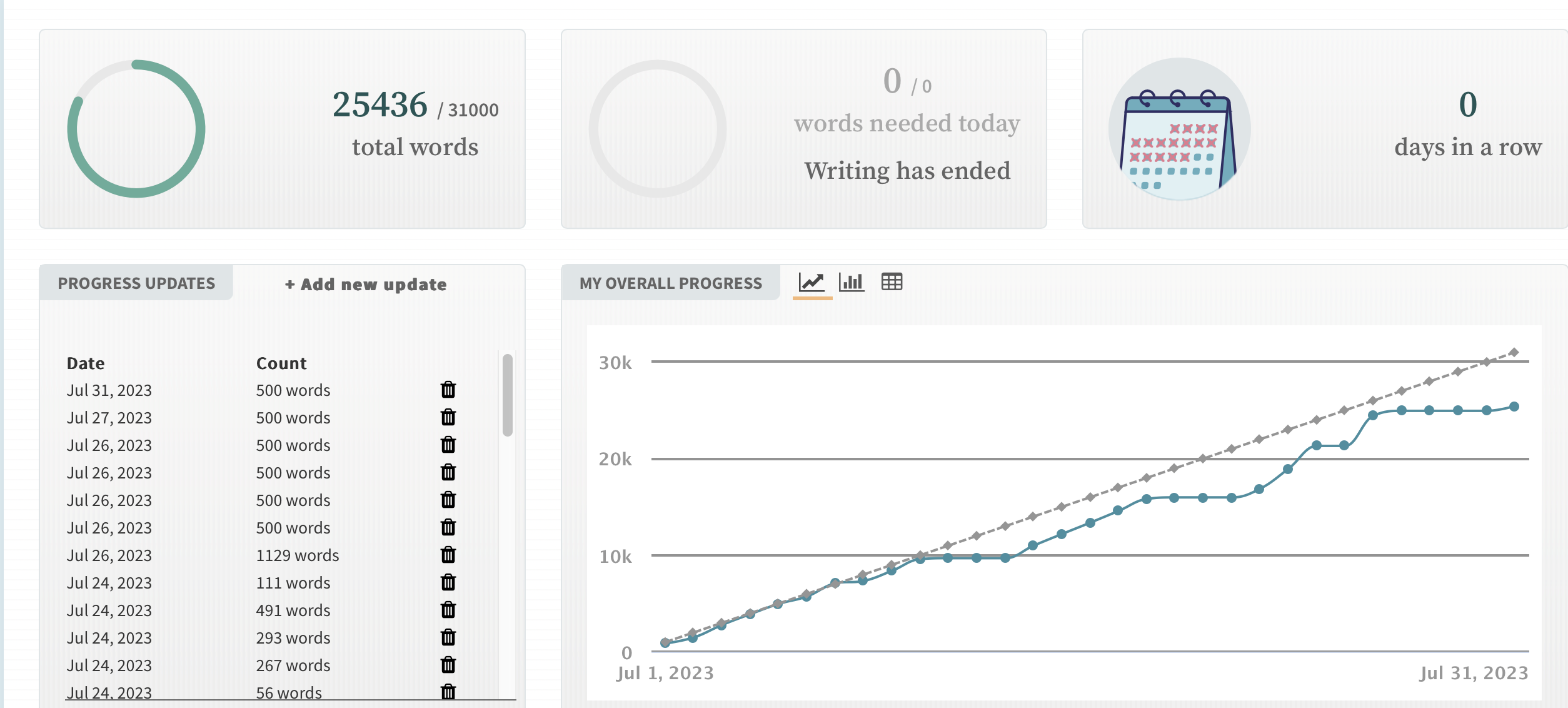 В июле написала 25 436 слов из запланированных 31000 — считаю, это успех. Много было поездок и других дел, но я старалась не сдаваться!