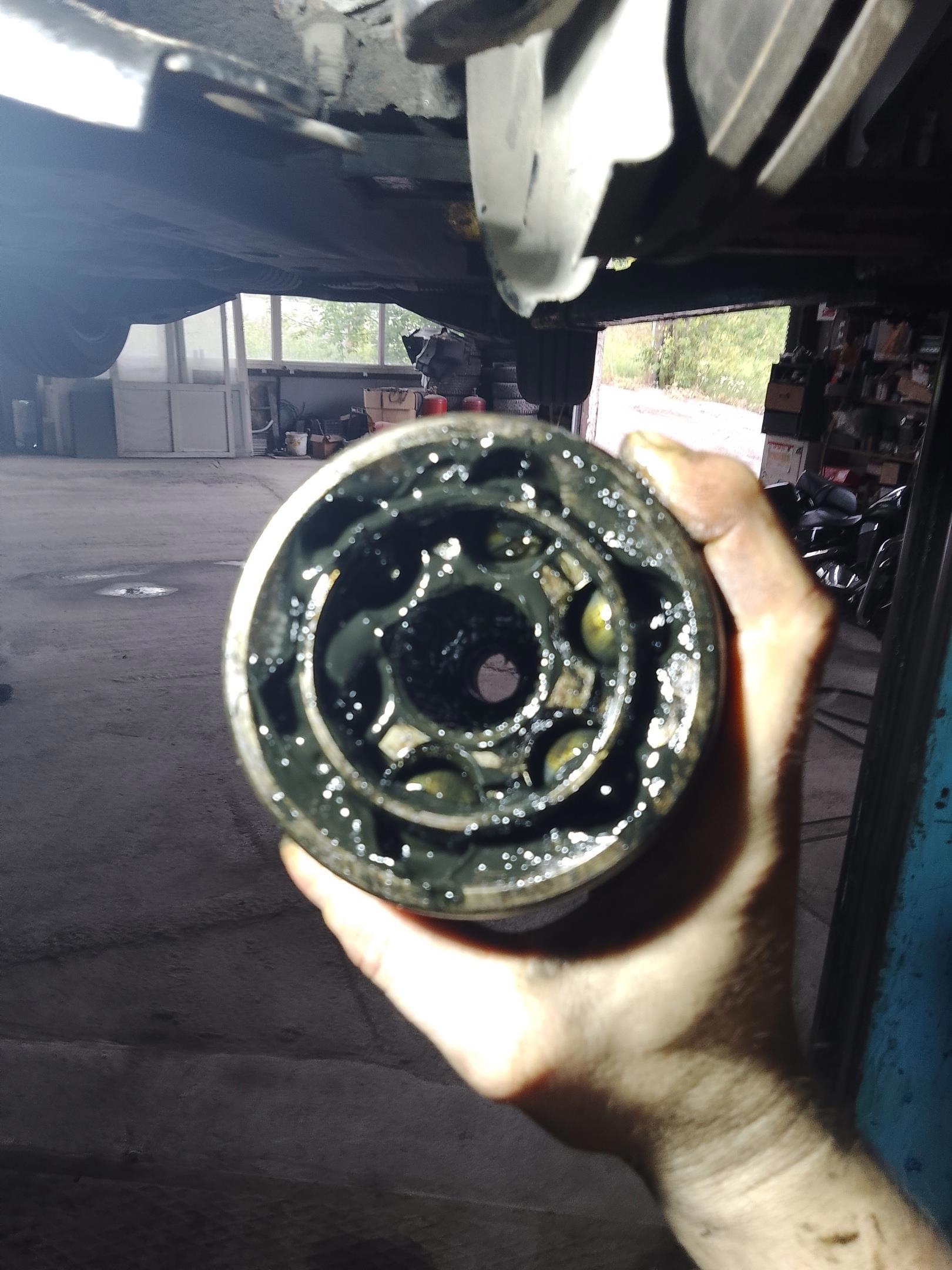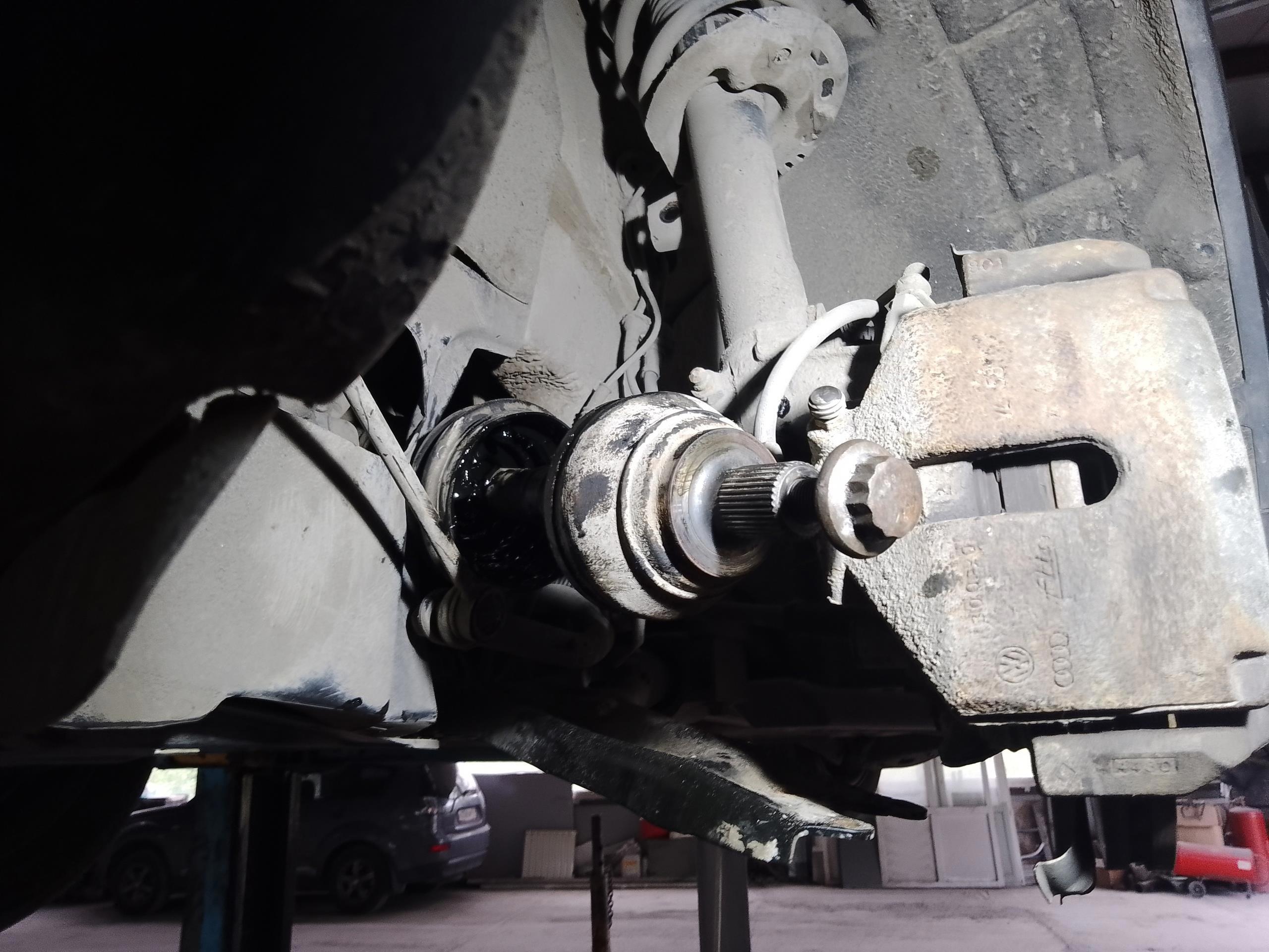 Шкода Октавия Скаут, замена пыльника наружнего ШРУСа. Разборка классическая, разве что шаровая, которая на 3х шпильках не открутилась, а одна шпилька обломилась. Пришлось вышибать ее из кулака, откручивать оставшиеся гайки, и снимать, нести на пресс, выдавливать обломок шпильки, и ставить болт. Но это лирика. Шрус на Шкоде обычно снимается двумя способами: либо сзади со стороны шариков есть стопорное кольцо, которое надо сжать и сдёрнуть ШРУС, либо он выдавливется болтом, которым прикручен. Вышлядит это вот так: