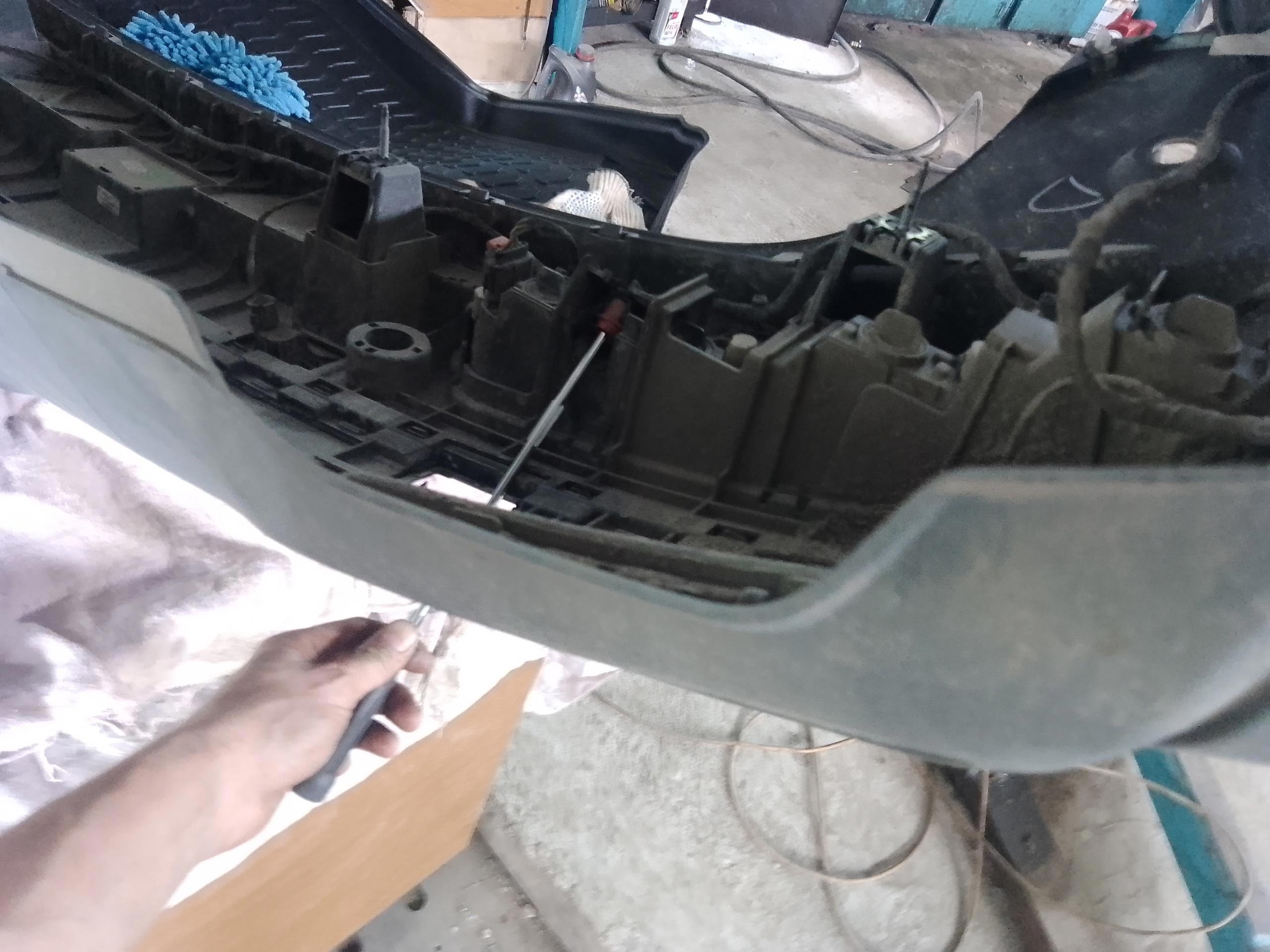 Под углом ровно 45 градусов!1 И никак иначе. Поспойлерю, когда всё собрали, попытались попасть, и ничего у нас не вышло. Никак. Вообще. Сняли лампу, а она живая. Ставим другую, цепляем бампер к машине, заводим, включаем задний ход - не горит. От ж сцука! Несем бампер на стол. Проблема в электрике. Отцепил разъём косы бампера от фонаря, прозвонил от разъёма к кузову - есть все провода, всё делое. Звоню фонарь от разъёма до заднего хода, выявляю пины заднего хода - всё целое. Ставлю лампу - пины не звонятся. От ж!... Ладно. Звоню цоколь - звонится. Значит проблема в месте контакта цоколя с фонарем. На фонаре контакты не растопырить, там всё жестко, а вот на цоколе их можно немного подвытащить, чтоб улучшить контакт. Фоток нет... Торопился. Итого, ставим цоколь, звоним - есть контакт! Несем бампер к машине, подключаем, заводим, включаем задний - нет горит. ...! Потом вспоминаю, что разъём на фонарь не одел, одеваю, и всё заработало! Кто молодцы? Я молодец! =)) Починиль! Поставили с директором бампер, и отдали машину довольной владелице.