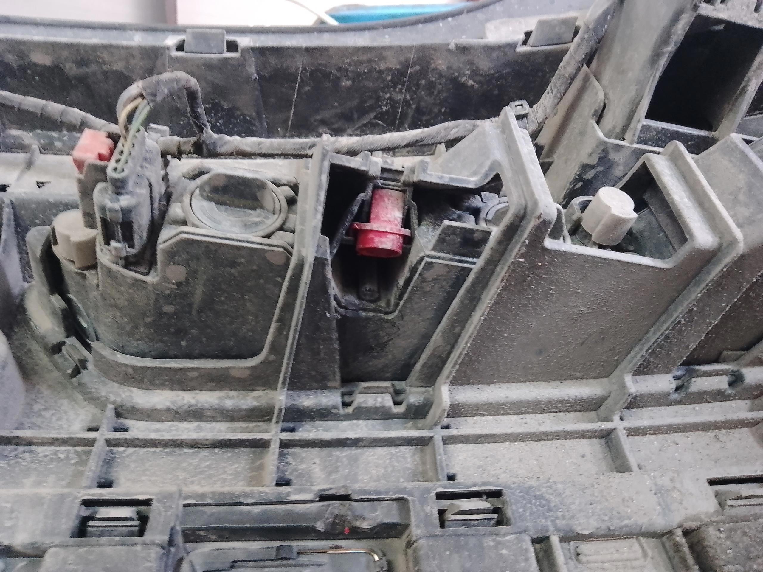 Начинаю копать вопрос, смотреть видео и гору картинок, и понимаю, что вариантов этого бампера два. У нас рестайл. А на доресте заглушка сразу под фонарем, и под ней винт. Изучение мануала показало, что в инструменте есть специальная отвертка, которую надо вставить под заглушкой, и открутить болт. Попытки этот болт поймать не привели ни к чему. Владелица автомобиля приуныла, ибо приехала на ТО пораньше из-за надоедливого сообщения о нерабочей лампе. А ещё там есть нюанс, описанный в мануле. Раз в год надо снимать фонарики. Чтоб болты крепления не приржавели. Как тебе такое, Илон Маск??! Ну шо, снимаем бампер! И видим фонарь. Красная бимба - искомый болт.