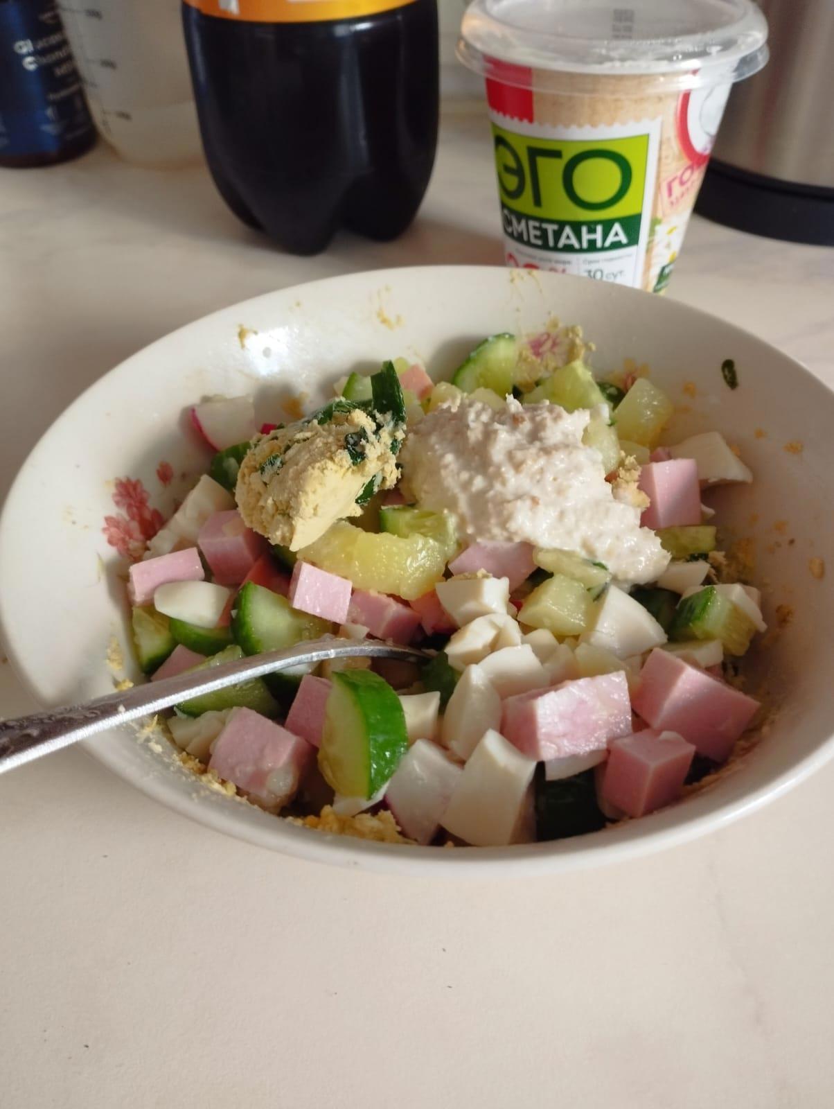 Вареного мсява, к сожалению, не случилось, обхожусь колбасой. Картошка, яйца, огурцы, редиска.