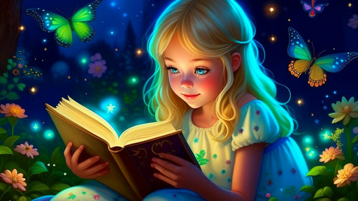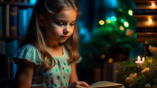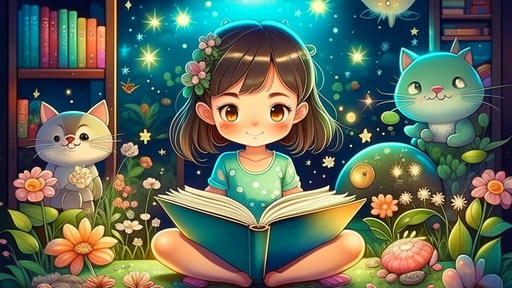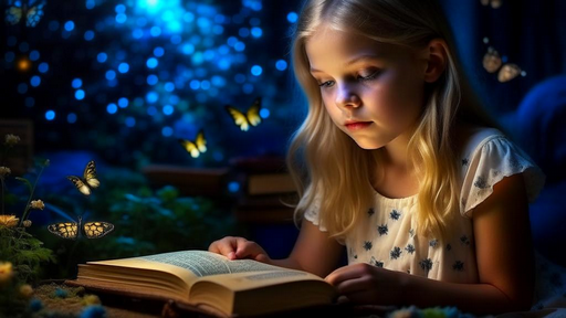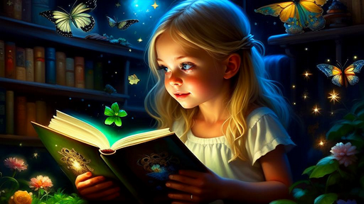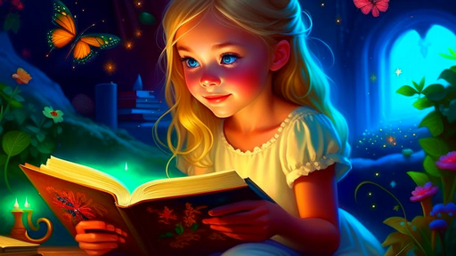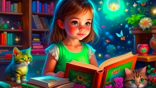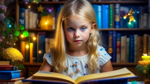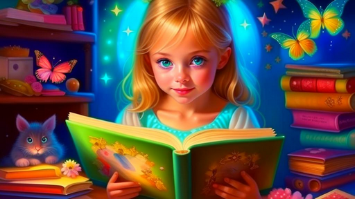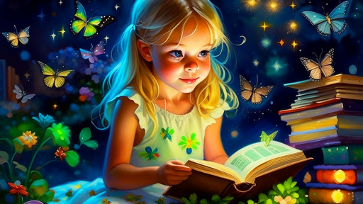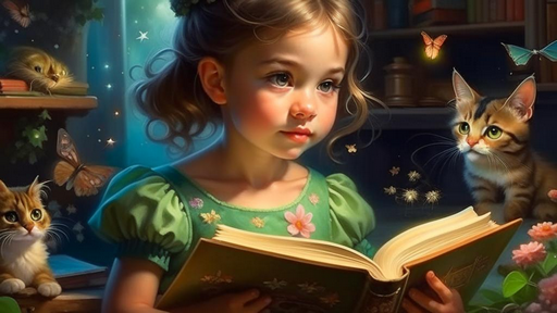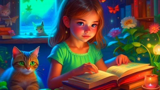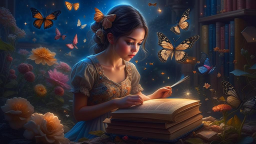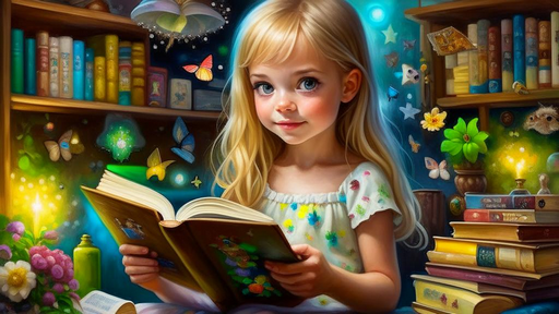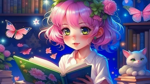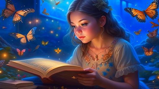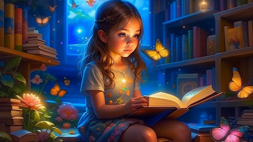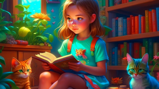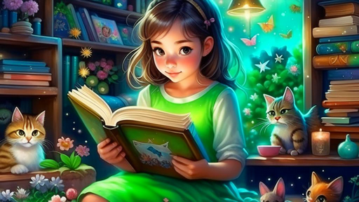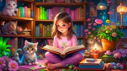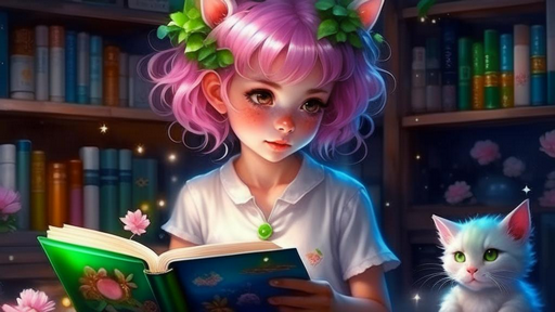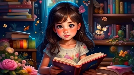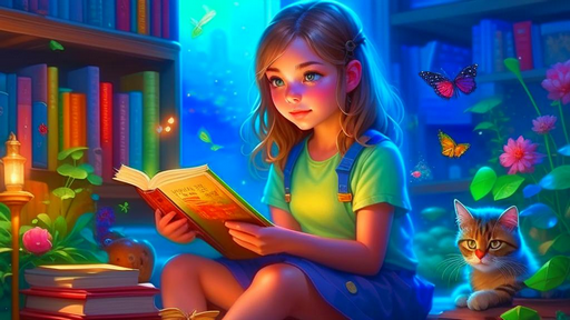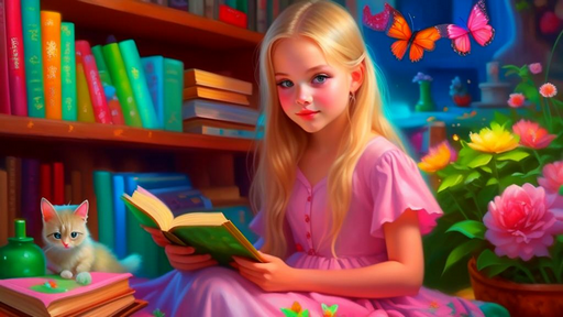 Тему придумал такую: «Девочка читает книгу». Потом писал различные текстовые задания для нейросети. Они же — промпты, запросы. Полки с книжками, котики, бабочки, цветочки...