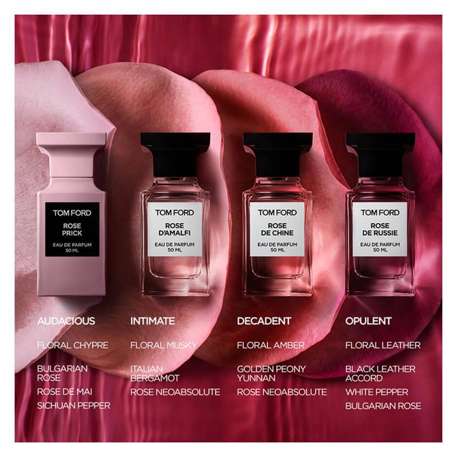 "Эта прекрасная незнакомка с первых секунд проявляет свою опасную натуру. Композицию открывают цветочные ноты болгарской и майской розы, которые пронзают жгучий сычуаньский перец и экстракт куркумы, придающий аромату имбирную пряность. Средние ноты TOM FORD ROSE PRICK раскрываются звучанием одного из самых редких сортов розы в мире. На производство одного килограмма масла из болгарской розы уходит около миллиона бутонов. Его пленительный аромат оттеняют древесные ноты индонезийского пачули, наполняющие композицию шипровыми оттенками, обжаренные бобы тонка и притягательные ноты карамели и ванили. Шлейф из толуанского бальзама и мускуса обволакивает ослепительно прекрасные розовые лепестки, защищенные острыми шипами. Сладкая боль останется с вами даже после того, как вы избавитесь от ее источника."