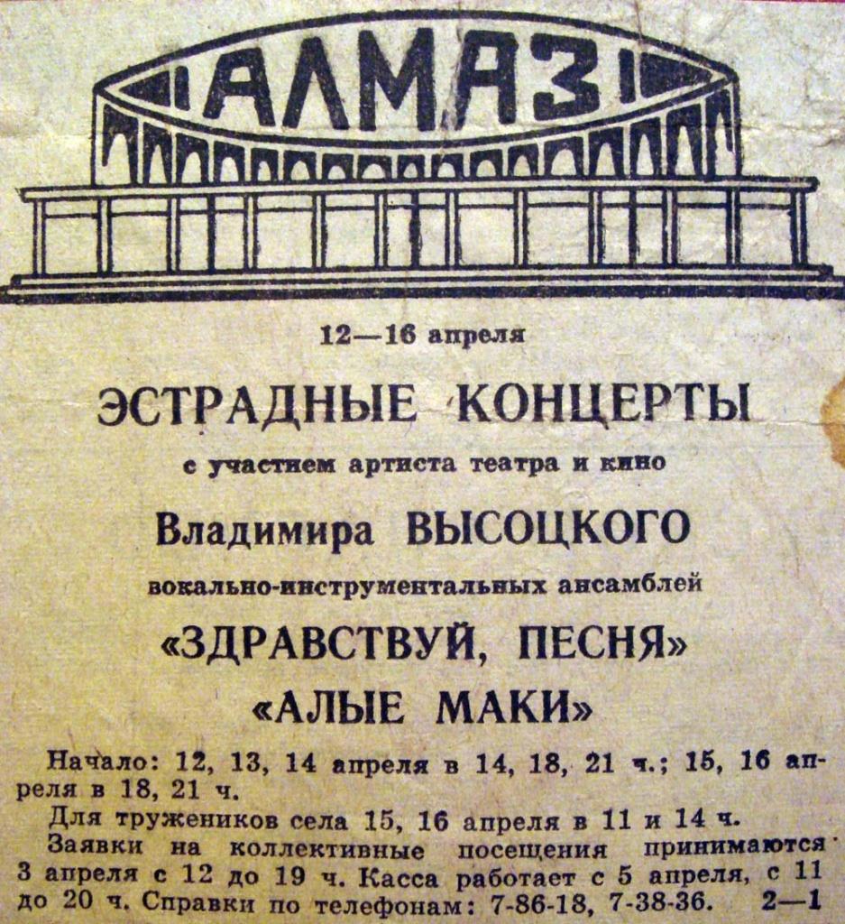 25 июля 2023г исполнилось 43 года со дня кончины Владимира Семёновича Высоцкого. 12-16 апреля 1978г он выступал с концертами в Череповце и мне довелось присутствовать на одном из выступлений. Спортивно-концертный зал «Алмаз» был заполнен до отказа. В первом отделении – вокально-инструментальные ансамбли «Алые маки» и «Здравствуй, песня!», а во втором – Высоцкий и, конечно, все зрители ждали именно его.