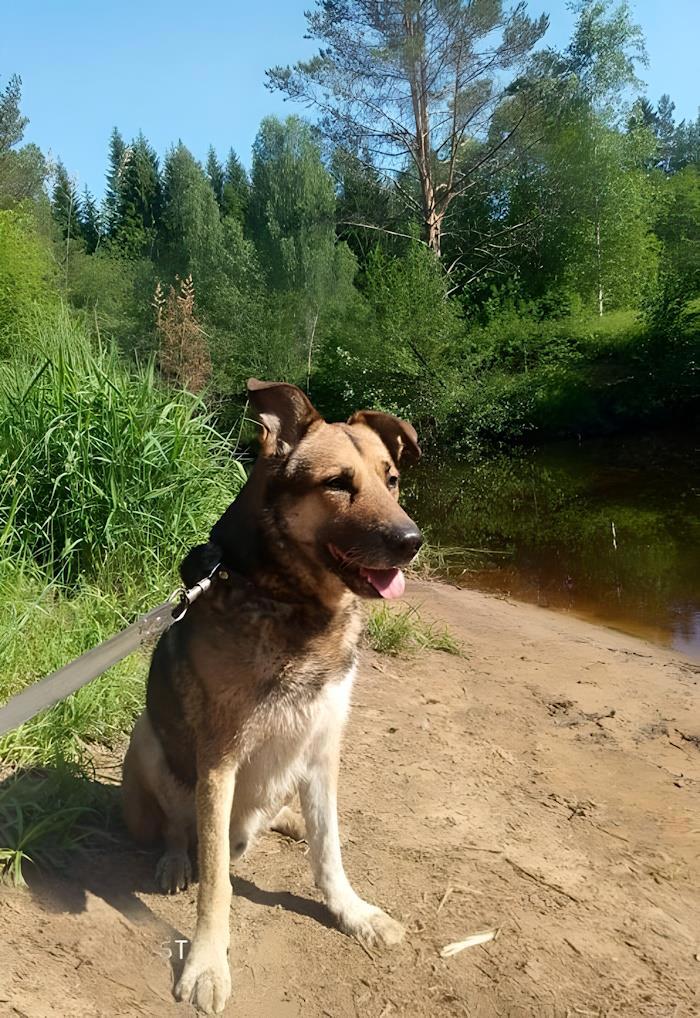 Дед в последний год. На поводке, чтоб в речку не лез: уже суставы болели.