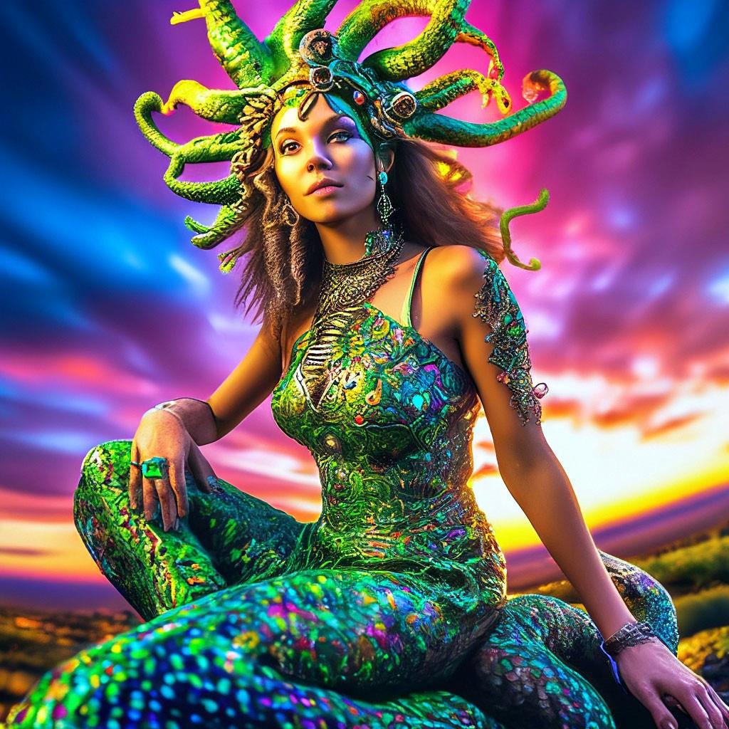 А такой была бы Медуза, если бы в то время, когда греки сочиняли мифы, было бы движение хиппи. Хотели бы жить в коммуне с такой красавицей с хладнокровными домашними животными?