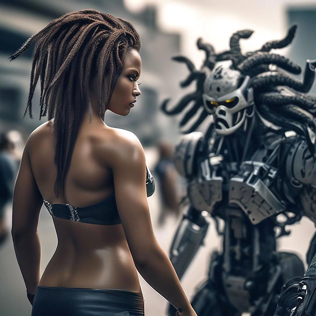 Сцена из Терминатора, где терминатор с функциями Медузы Горгоны. А чернокожая девушка это видать Сара Конор нового времени.