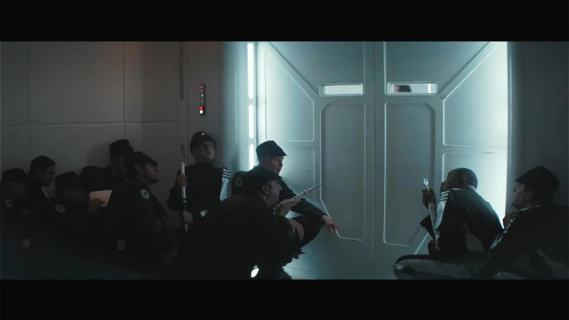 В один момент во время сцены побега показывают имперских работников тюрьмы, которые закрылись в какой-то комнате с электрошокерами в руках. Они сидят, что называется, тише воды, ниже травы. На двери, которая отделяет их от разъярённой толпы, имеется застеклённое окошко. Поэтому, чтобы не быть увиденными, имперцы чуть ли не лежат на полу, лишь бы не оказаться в поле зрения врагов. Они там пошевелиться боятся. Да даже чихнуть боятся (фото ниже)!
