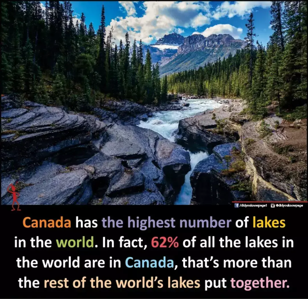 В Канаде больше всего озёр в мире. 62% всех озёр в мире находится в Канаде. Это больше, чем суммарное количество всех остальных озёр в мире.