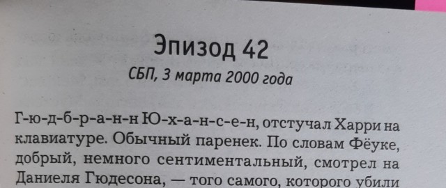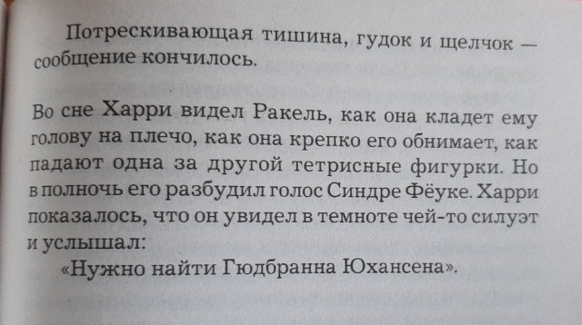 Как вы думаете, как Харри на него вышел? Выстраивал логическую цепочку из улик и сведений от свидетелей? Нет, ему просто приснилось, как Синдре Фёуке сказал ему искать Гюдбранна. А может и не приснилось. А может и не может. А может Фёуке действительно с нифига приходил к нему посреди ночи. Во всяком случае, это так написано.