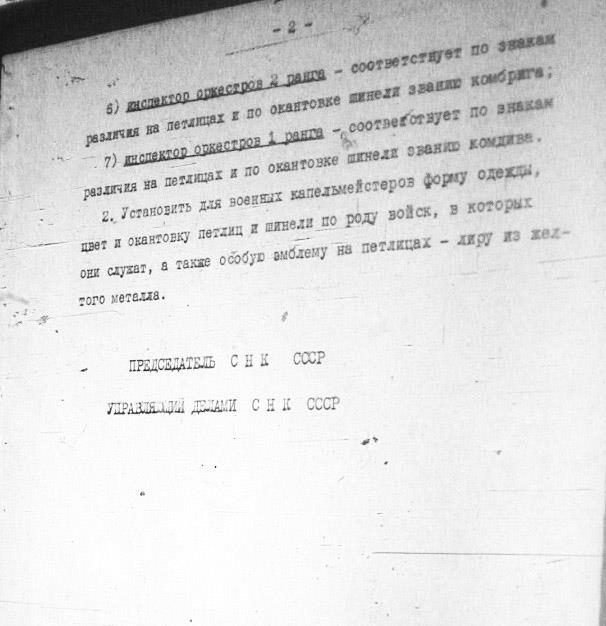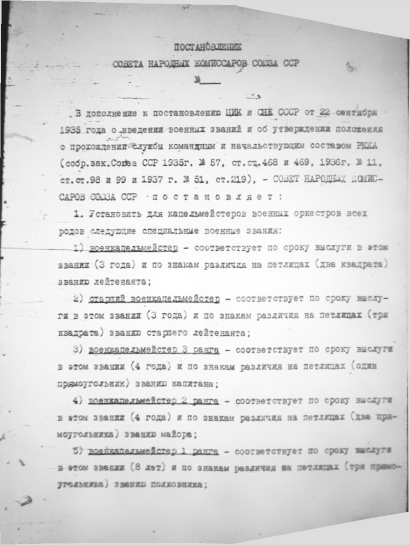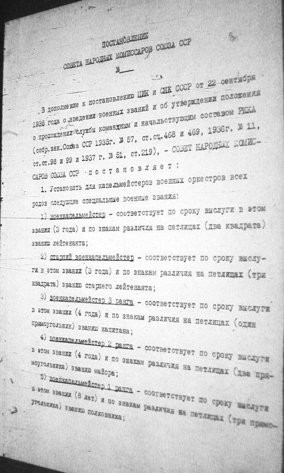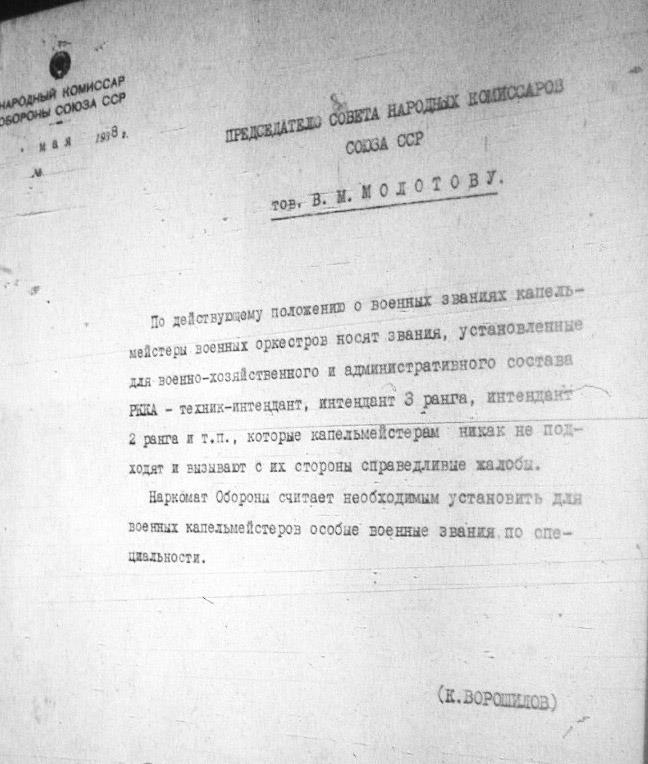 Наркомат Обороны считает необходимым установить для военных капельмейстеры особые военные звания по специальности.