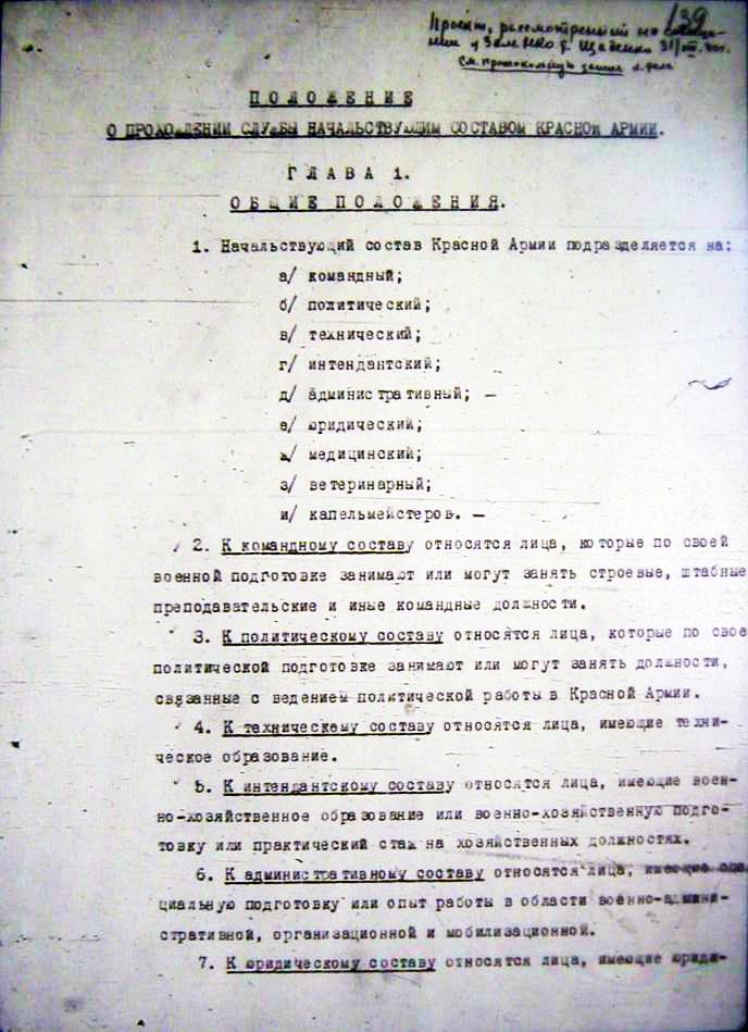 Первое мое предположение о том, что в газете не было политических должностей, потому и присвоили административно-хозяйственное – оказалось ошибочным. Я рассуждал, что при назначении писателя корреспондентом «Известий», в штате газеты не было нужной вакансии, потому его назначили в снабженческий аппарат, присвоив звание, соответствующее должности. Но это никак не объясняло другие схожие случаи. Совсем уж было, собравшись начать поиски в штатах армейских газет, я обратился с этим вопросом к человеку, давно занимающемуся историей нашей страны, в частности – историей военной формы одежды. Ответ оказался достаточно простым: звание присваивались по результатам аттестаций и в соответствии с «Положением о прохождении службы начальствующим составом Красной Армии». Полистав найденное в интернете «Положение…», ответа на вопрос так и не нашёл, но мне помогли вновь, передав электронные копии документов 1938 – 1940 г.г. с проектами изменения «Положения…». В одном из первоначальных вариантов, я и нашёл требования, выдвигаемые к командному составу, назначаемому на должности политработников. Скорее всего, эти положения лежали в основе аттестации на звания.