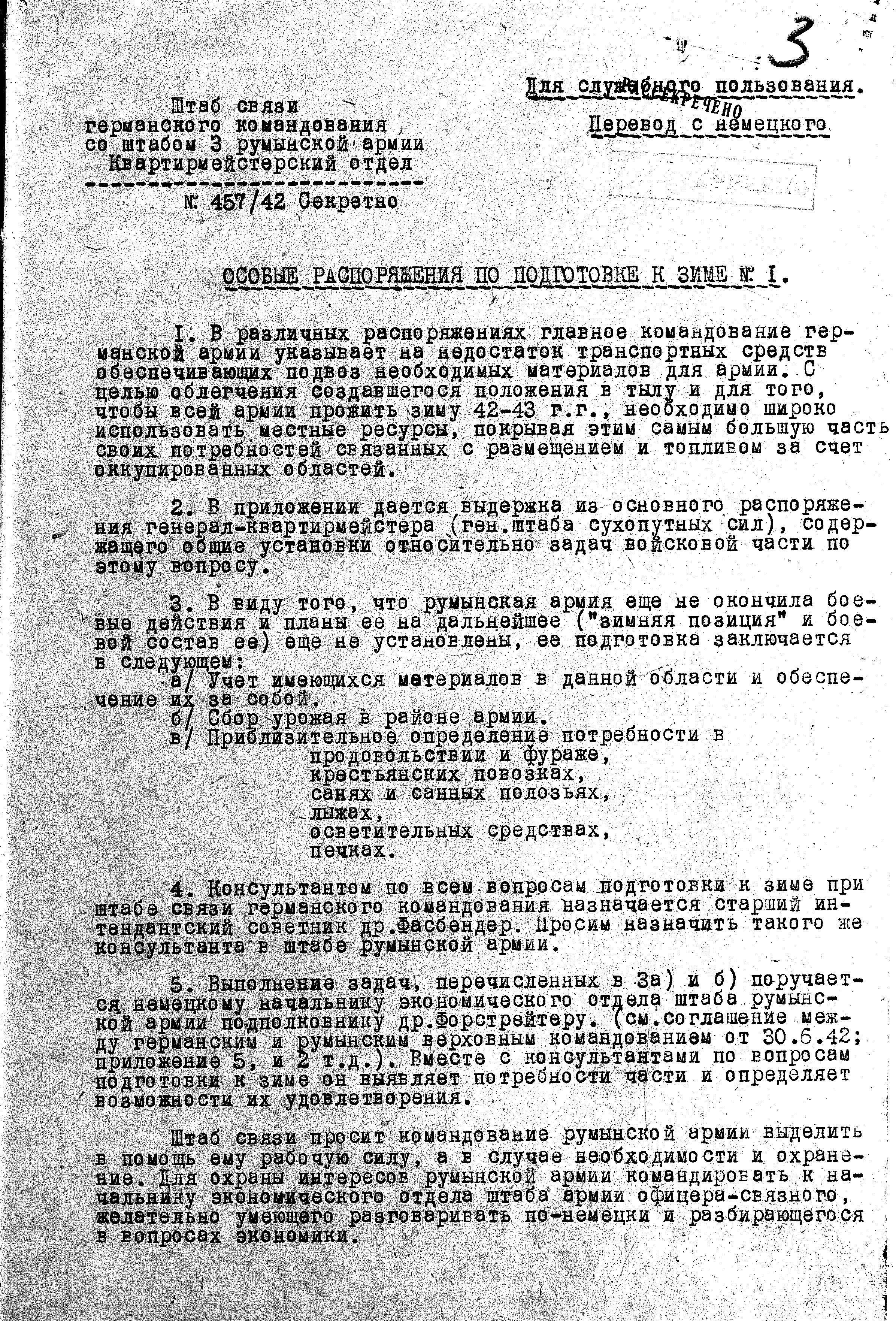 Распоряжения по подготовке к зиме румынской и немецкой армий (1942-1943 г.г.)