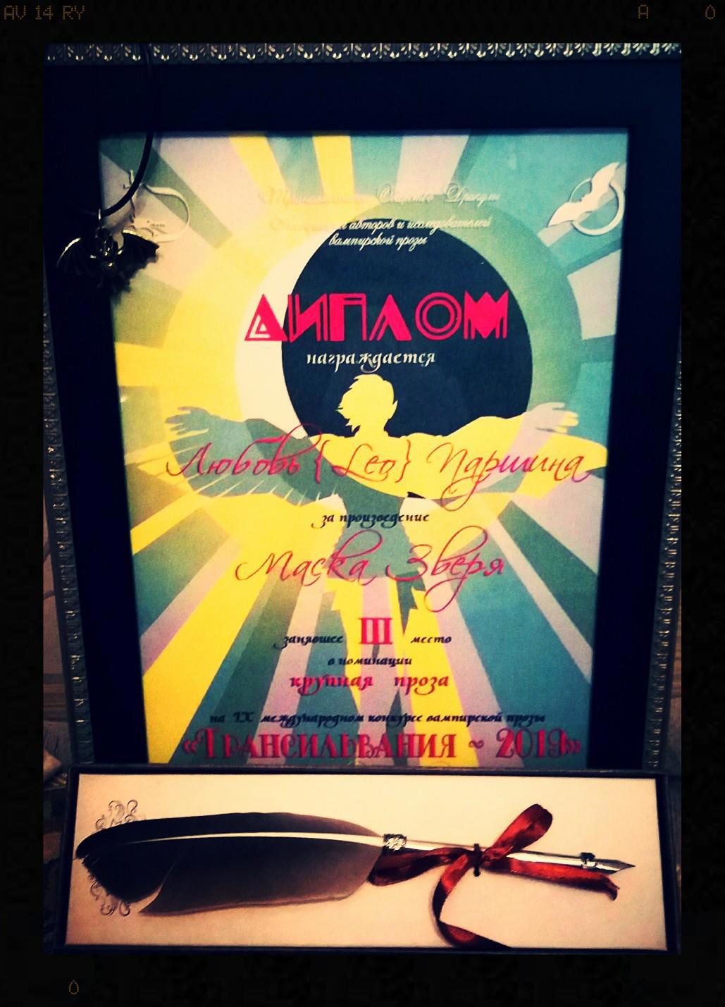 Третье место в номинации "Крупная проза" за роман "Маска Зверя". При чем, все логично - Сашенька-гимназист, главный герой романа, как раз троечник. Что еще он мог принести?