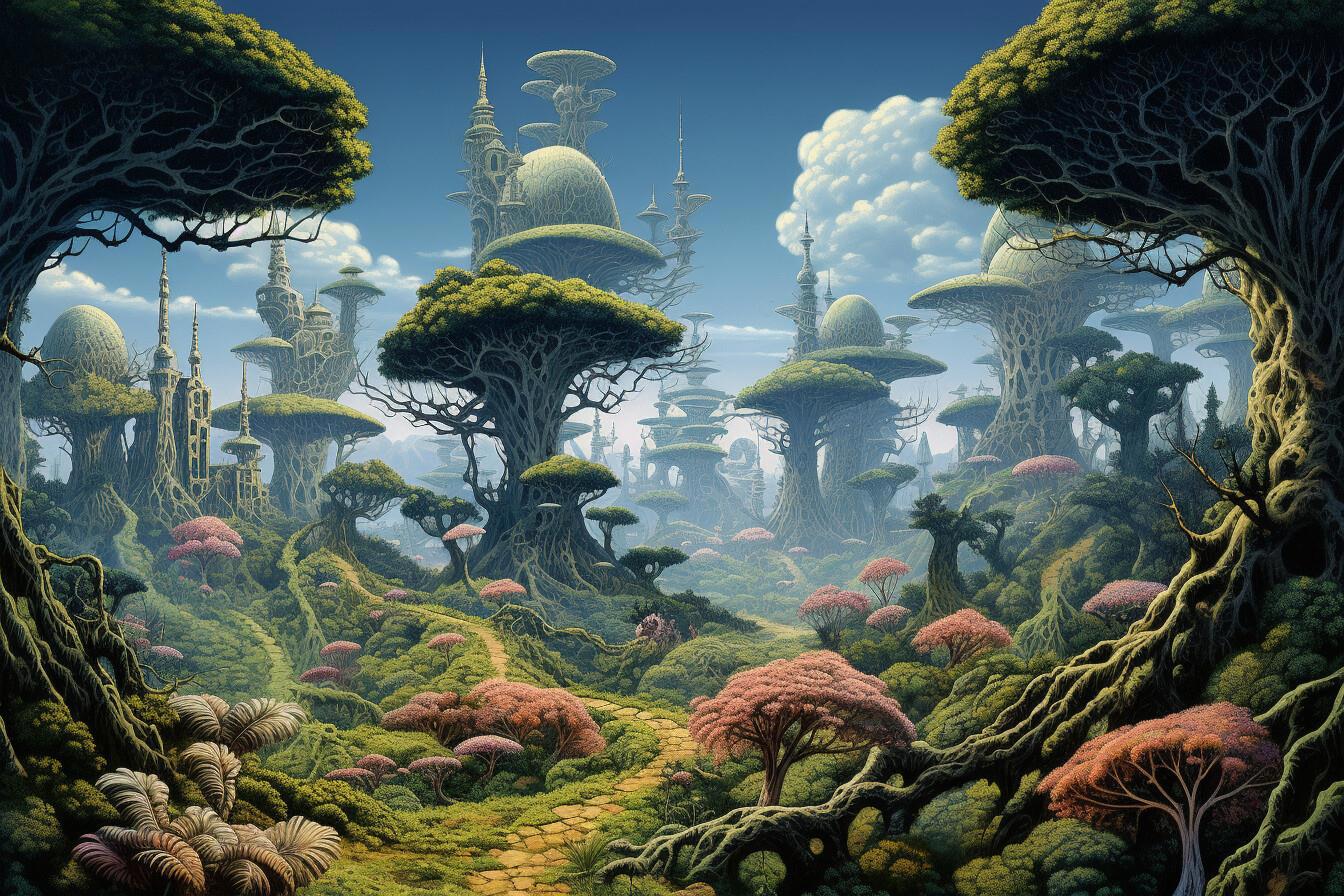 Но если вам нужен фантастический пейзаж - это тоже запросто. Вдобавок Проблембо хорошо учитывает указанный в промте стиль конкретного художника или направление живописи. Вот, например, инопланетный пейзаж в стиле Родни Мэтьюза: