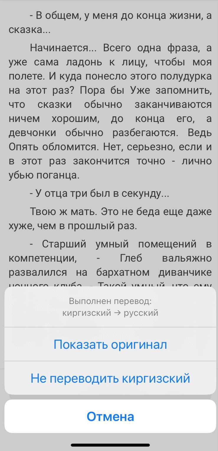 Я не понимаю, каким местом Яндекс (для работы с АТ с мобилки пользуюсь приложением Яндекс, которое имеет функцию перевода текстов) опознал текст книги как написанный на киргизском. И почему именно этот текст, так как ранее подобного не случалось. Но факт остается фактом. Опознал и сделал перевод, который превратил текст в нечитаемую белиберду.