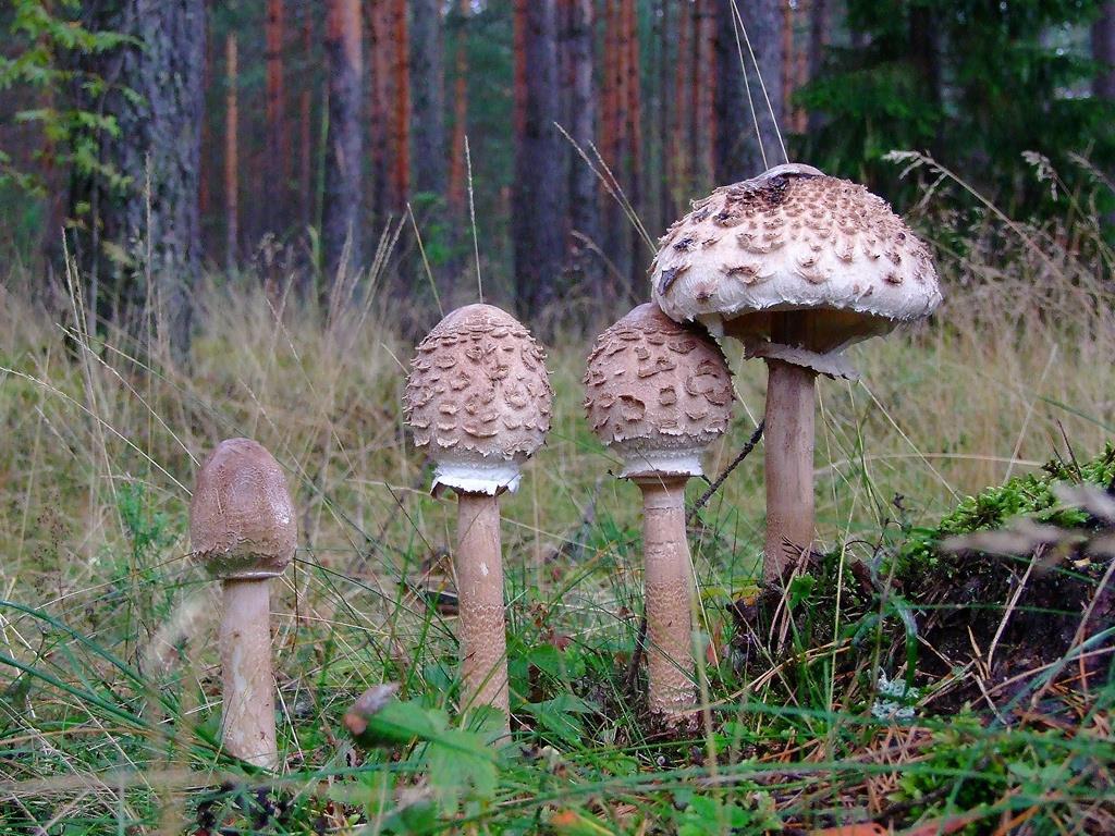 Любые крупные зонтики (Macrolepiota, Chlorophyllum) имеют подвижное плоское кольцо на ножке (у поганки и других мухоморов оно юбкообразное и приросшее), более или менее чешуйчатые шляпки и окрашены без следов зеленой окраски - они бывают белыми, сероватыми, бежевыми, коричневыми, но никак не зелеными. Мелкие же зонтики (Lepiota) сами по большей части ядовиты, некоторые и вовсе смертельно. Разные безграмотные в грибных вопросах ресурсы нередко пытаются впарить публике за бледную поганку безобидный пёстрый зонтик, который можно есть даже сырым. Потом из-за этих неучей дорвавшийся до леса обыватель старательно топчет все попавшиеся ему зонты и их близких родственников. Вот пример одного такого невообразимо бестолкового видео.