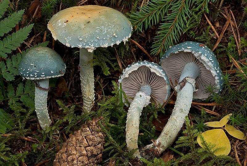 Сине-зеленые строфарии (Stropharia aeruginosa; S. caerulea; S. pseudocyanea) - тощие грибцы с приросшими серыми, а затем темнеющими пластинками, и холодной синеватой окраской; последний вид при этом - мелкий, отчетливо пахнет молотым черным перцем и растет на лугах. Кольцо у строфарий - воротничковое или раструбовидное («перевёрнутая юбка») и в зрелости тёмное, почти чёрное сверху от осыпающихся спор. Помимо прочего, поганка никогда не растет на древесине, тогда как строфария вполне не против залезть на старый сосновый пень. Два первых вида - съедобны (а первый еще и вкусный), третья - тоже не отравит, но горькая.