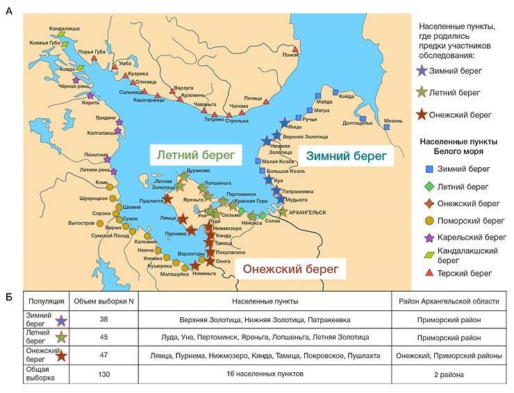 Генофонд Онежского берега выявляет обширную область генетического сходства: она охватывает почти всю Финляндию на западе, с востока четко очерчена Северной Двиной и Сухоной, на юге и юго-западе России доходит до Ярославской и Ленинградской областей. В эту область сходства входят и финноязычные народы (вепсы, ижора, ингерманландцы, карелы, финны), и те русские популяции, в генофонде которых прослеживается существенный вклад дославянского населения.