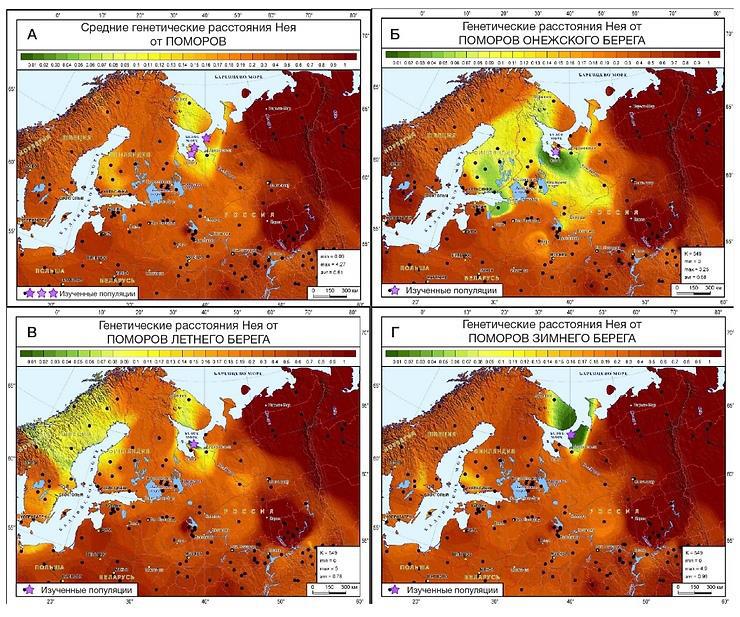 Карты генетических расстояний Нея от трех популяций онежских поморов. А. Общая (средняя трех карт отдельных популяций). Б. Онежский берег. В. Летний берег. Г. Зимний берег. Популяция, от которой рассчитываются расстояния, отмечена звездочкой. Зеленые и желтые тона отражают минимальные расстояния до популяции, красно-коричневые — максимальные. Суммарный генофонд поморов генетически близок к южной части Финляндии, а не более северной, представленной саамами.