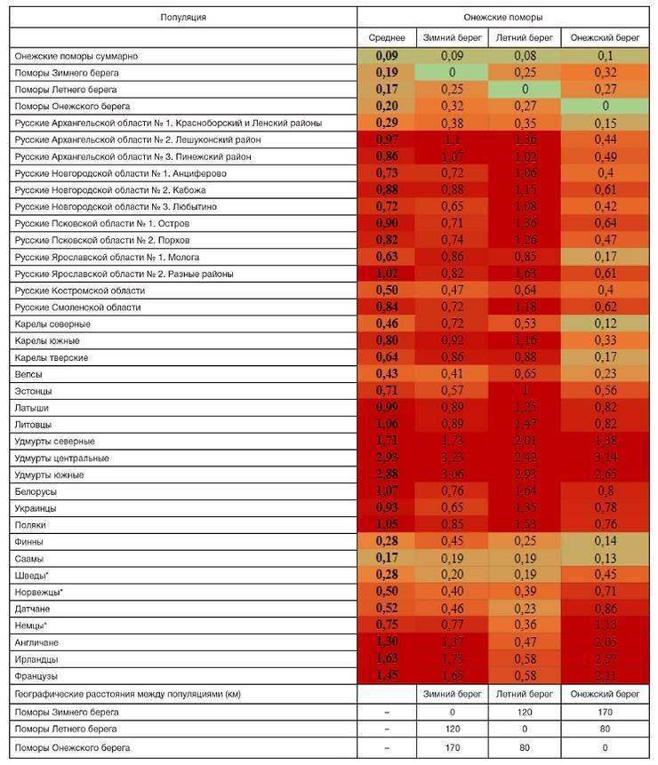При анализе степени генетического сходства (таблица) прежде всего удивляет, сколь велики генетические расстояния между популяциями поморов (d = 0,28) вопреки их географической близости и культурной общности. Более того, расстояние от онежских поморов до других русских популяций почти в три раза больше (d = 0,76), но есть и очень выразительные исключения (таблица). Наиболее близкой к генофонду онежских поморов (d = 0,29) оказалась географически удаленная популяция (около 500 км) русских Красноборского и Ленского районов Архангельской области. При этом она чрезвычайно близка лишь к поморам Онежского берега (d = 0,15), но генетически далека от Летнего (d = 0,33) и Зимнего (d = 0,38) берегов.